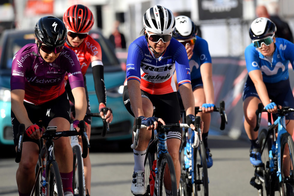 The peloton split before the half-way mark on a cobbled sector. Audrey Cordon-Ragot and Choe Hosking represented Trek-Segafredo in the front, joining most big-names on the right side of the split. There may have been teams with more numbers in the leading group, but Cordon-Ragot pulled up her sleeves and did the work of two.