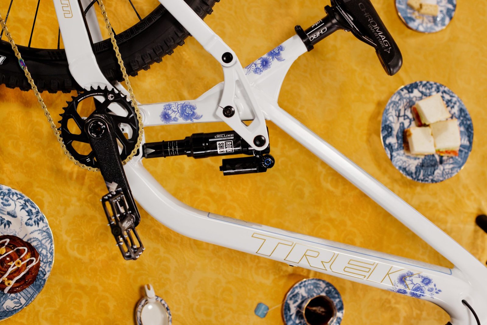 2025 is Semenuk’s 20th anniversary with Trek. Of course the brand is marking the occasion with a custom paint job. The scheme epitomizes Semenuk’s collaborative process and ability to find inspiration in places few people think to look. “Delicate” is a rarely-used descriptor in mountain biking, but that’s the first word that comes to mind when looking at Semenuk’s porcelain-painted fully proto “Sesh.” The bike would look right at home in a China shop (though maybe not welcomed by the store’s proprietors.)