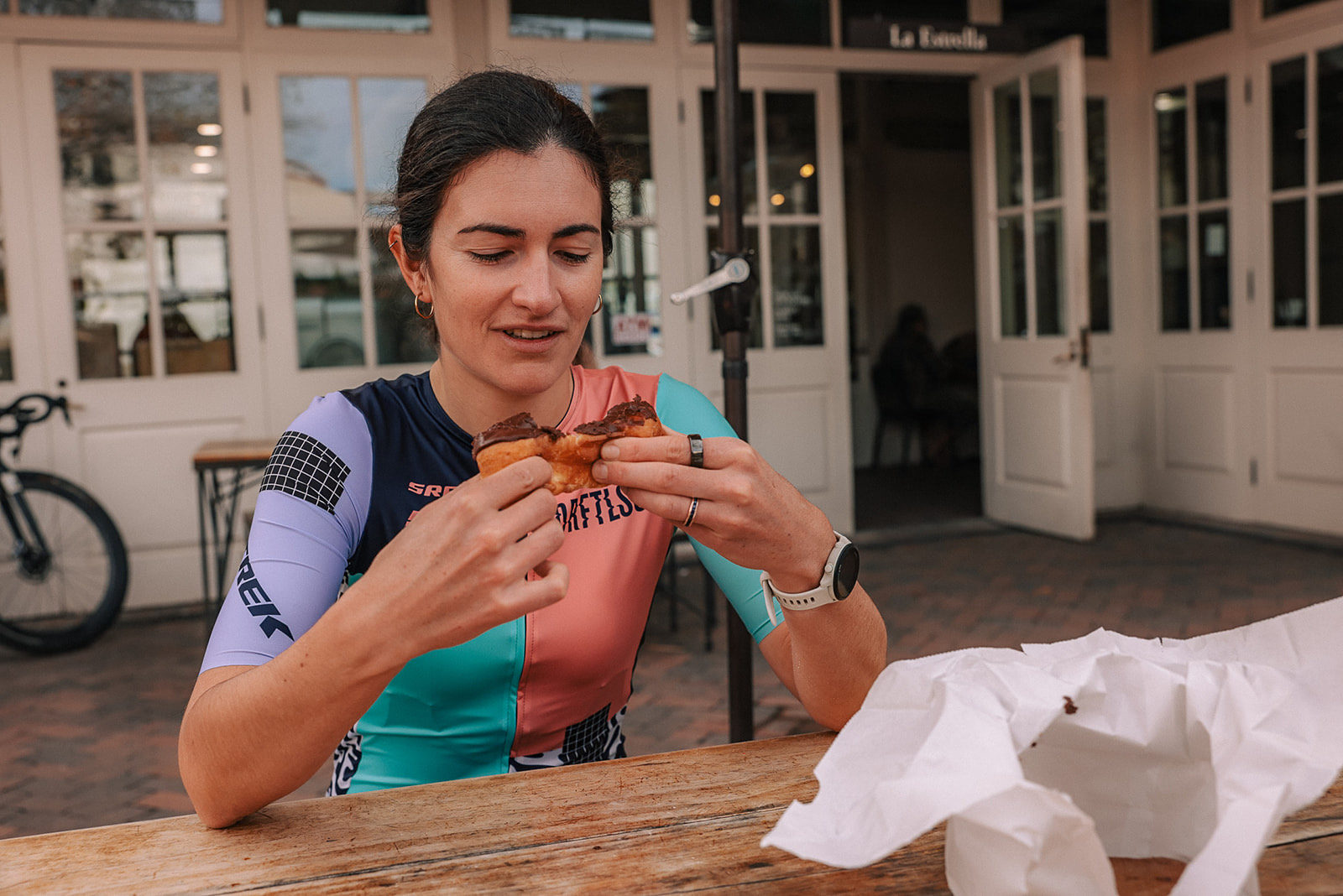 Cécile already is right at home with her new kit and bike.