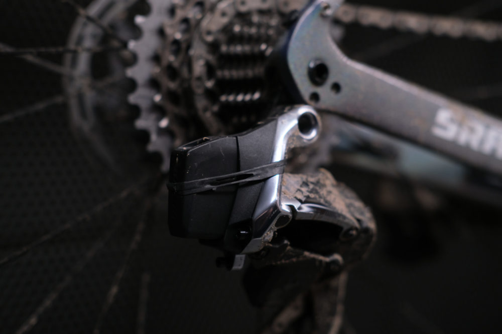 Our team mechanic added an insurance policy to the derailleur - a simple elastic band to ensure the battery stayed in place.