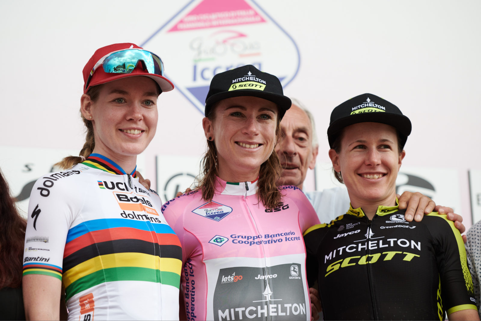 Top three in the General Classification: Annemiek van Vleuten (NED), Anna van der Breggen (NED), Amanda Spratt (AUS) after Stage 10 of 2019 Giro Rosa Iccrea, a 120 km road race from San Vito al Tagliamento to Udine, Italy on July 14, 2019. Photo by Sean Robinson/velofocus.com