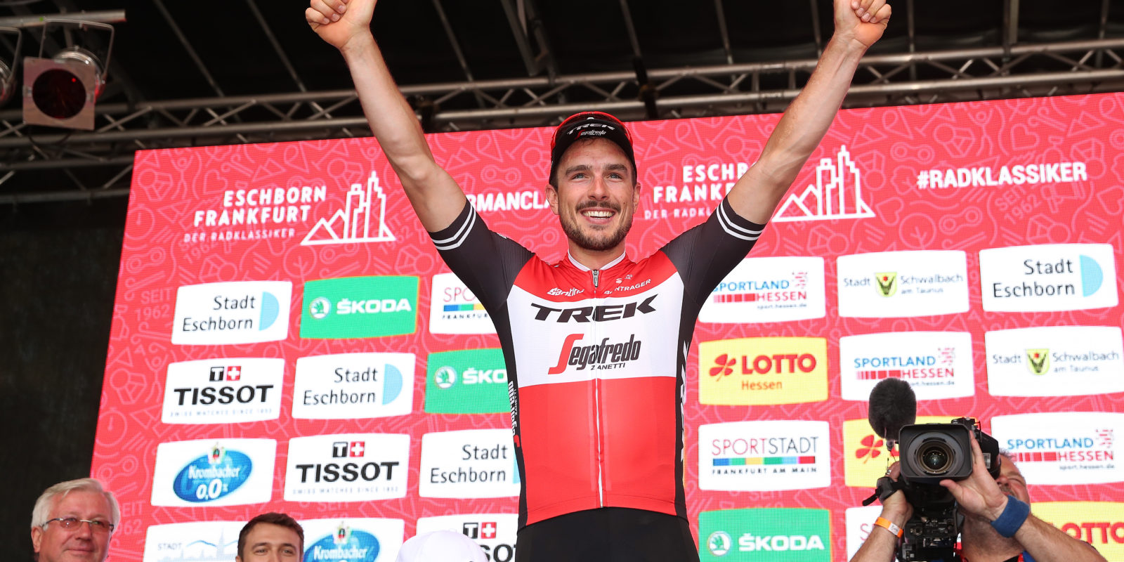 The added hills to this year’s edition of Eschborn-Frankfurt did not change the outcome for the German WorldTour one day race, which again ended with the fastmen putting on a show. John Degenkolb had a perfect sprint but could not overcome the speed of Pascal Ackermann (Bora-hansgrohe) who took the win. Four-time winner Alexander Kristoff (UAE-Team Emirates) settled for third, breaking his drive for five consecutive wins.