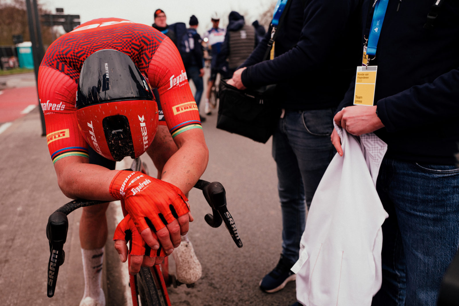 Speaking of the infamous climb, those steep slopes might normally deter a strong sprinter like Mads Pedersen, but the Dane attacked aggressively in the final 30 kilometers of Flanders in an all-in bid to steal the race win. And though he was absorbed by the pre-race favorites, Pedersen had the legs to sprint for the final spot on the podium. Absolutely no one rode harder that day, and the photos tell a story of all-out effort.