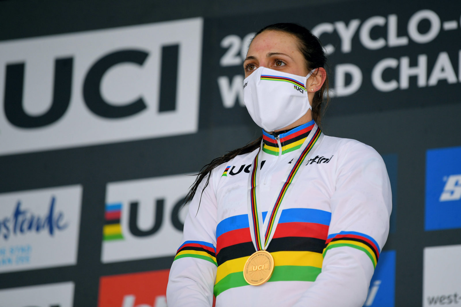 Lucinda Brand on the podium after winning the rainbow jersey at the UCI Cyclo-Cross World Championships