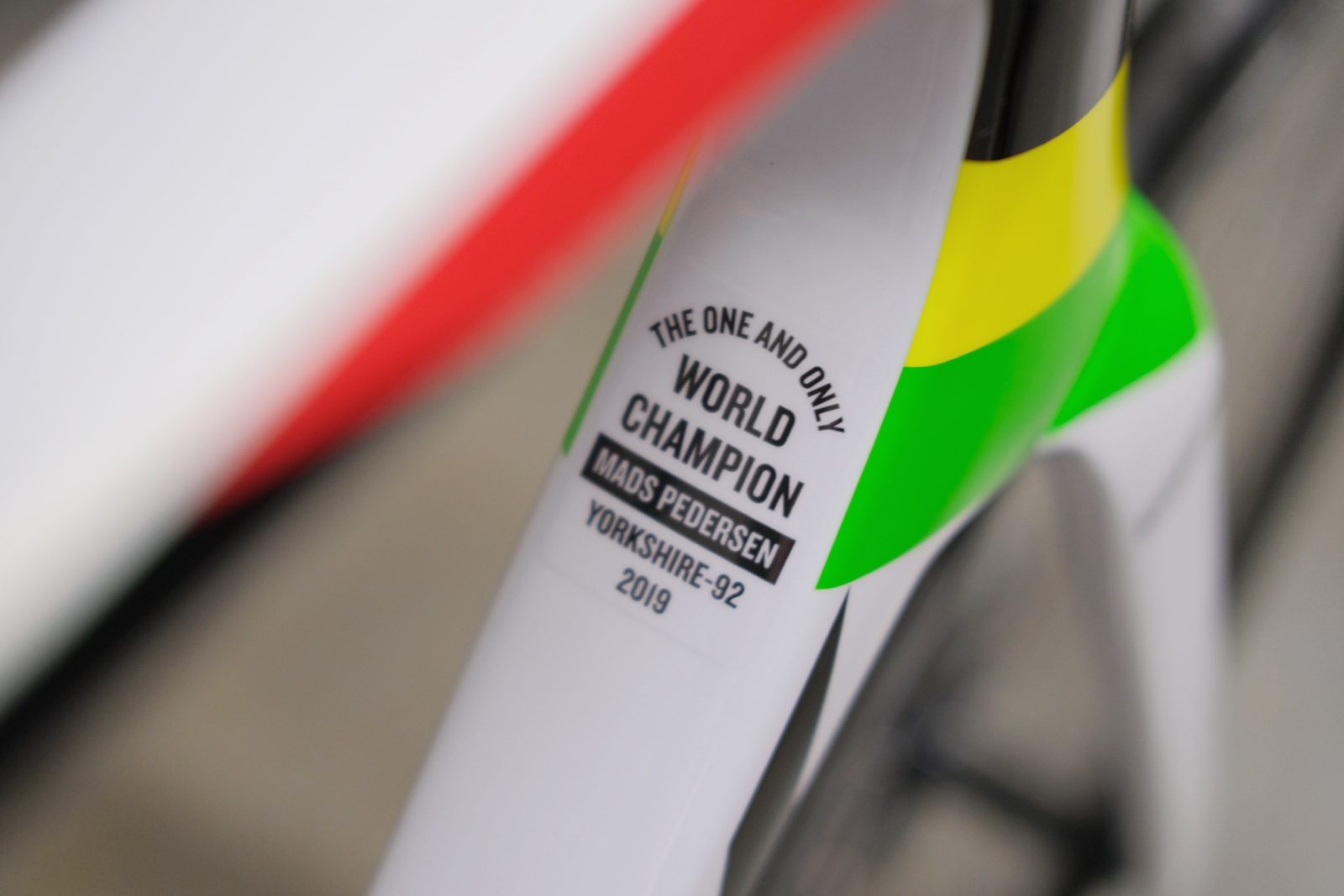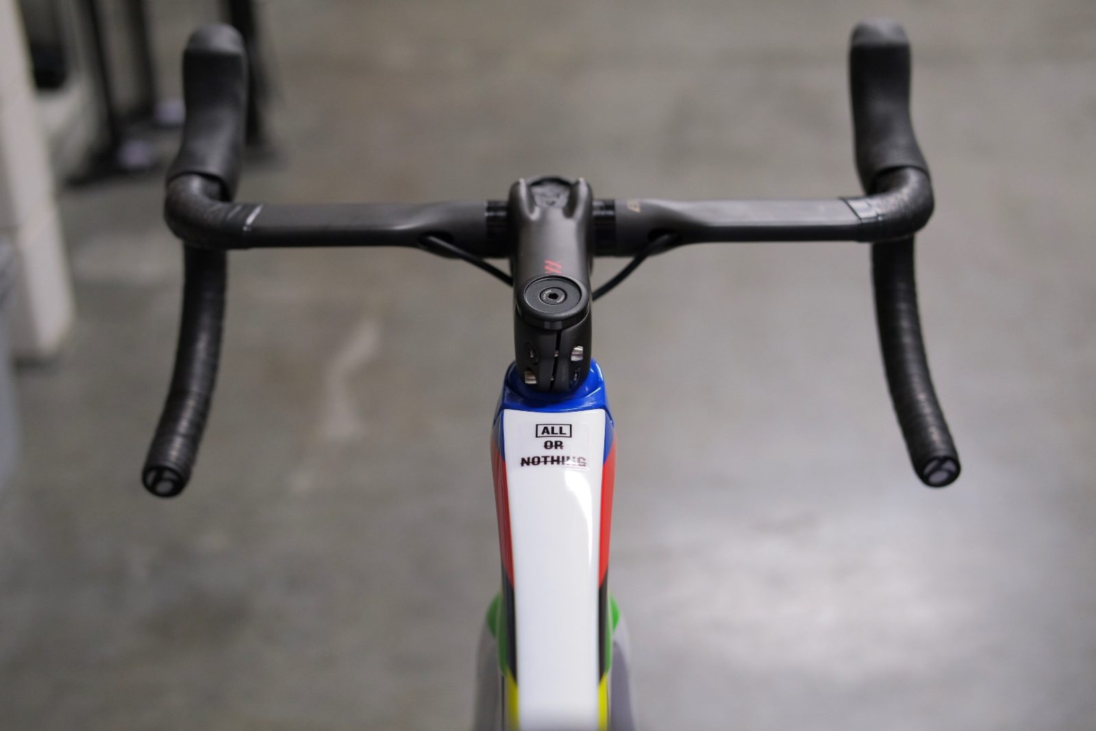 The stem and handlebars are not the latest Bontrager models. Mads wants to use exactly the same handlebar set up he used in the World Championships – never change a winning system, right?