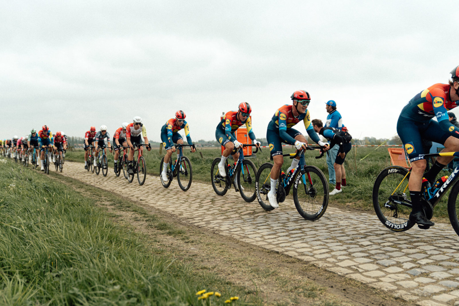 Lidl-Trek Future Racing came to Paris-Roubaix with a plan in mind, and the legs to execute it. But the day got off to a rough start. A massive crash in the opening phase disrupted the race and claimed Hector Alvarez, who unfortunately broke his elbow and was taken to hospital. Albert Withen Philipsen was also caught in the chaos and needed a bike change. The 18-year-old Dane had to dig deep to rejoin the peloton, just like teammate Seb Grindley, who also went down early on.