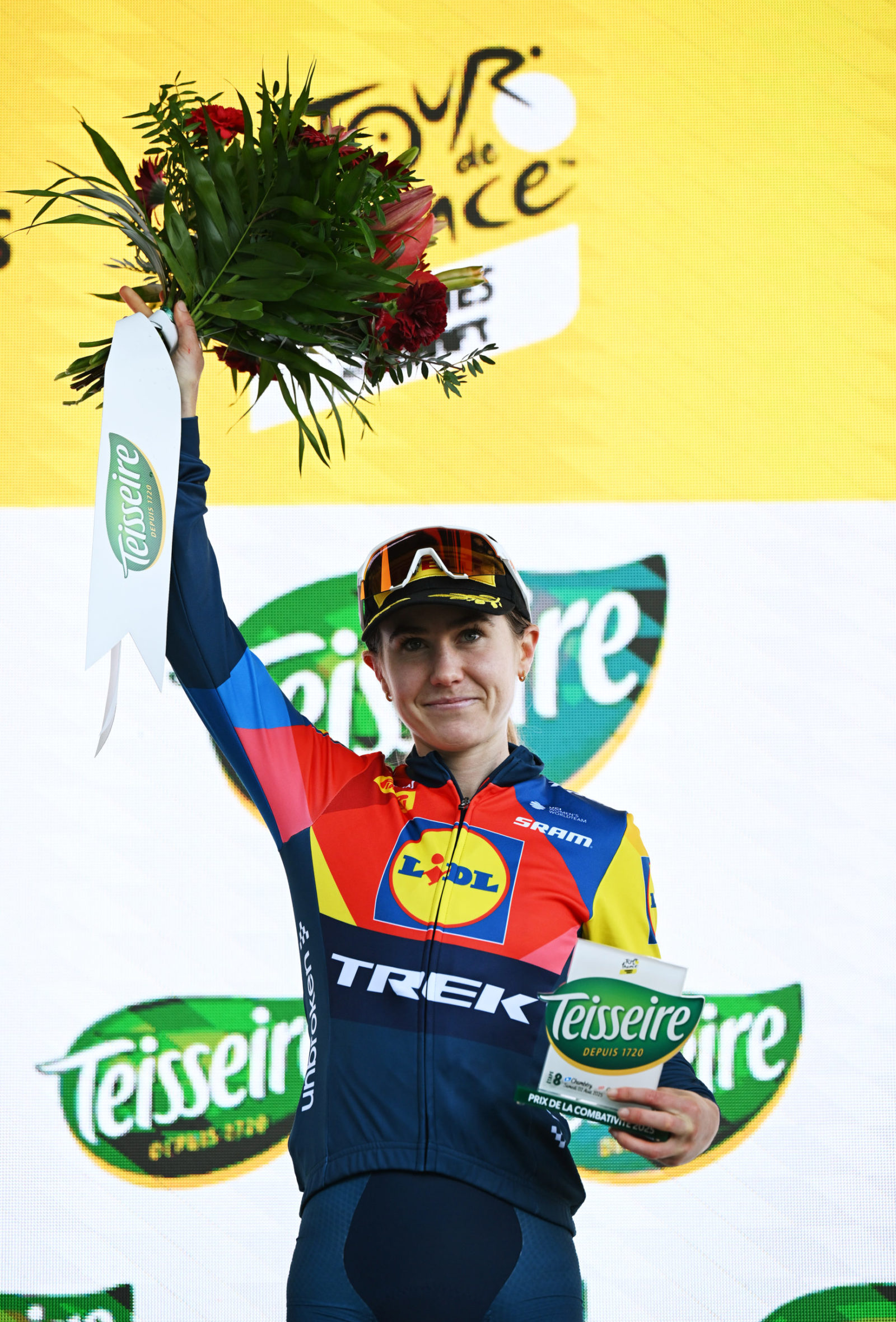 Riejanne got straight to work and made sure the breakaway pulled hard and gained as big an advantage as possible. With over 3 minutes on the peloton, Riejanne dug deep to bring Niamh into the bottom of the iconic Col de la Madeleine and give her the best chance possible to go for the stage win. Niamh settled into her rhythm and in the end, it was only the GC favourites of Ferrand-Prevot and Gigante that could better our climber. Niamh crossed the line in a fantastic 3rd place and earned a trip to the podium as the most combative rider.