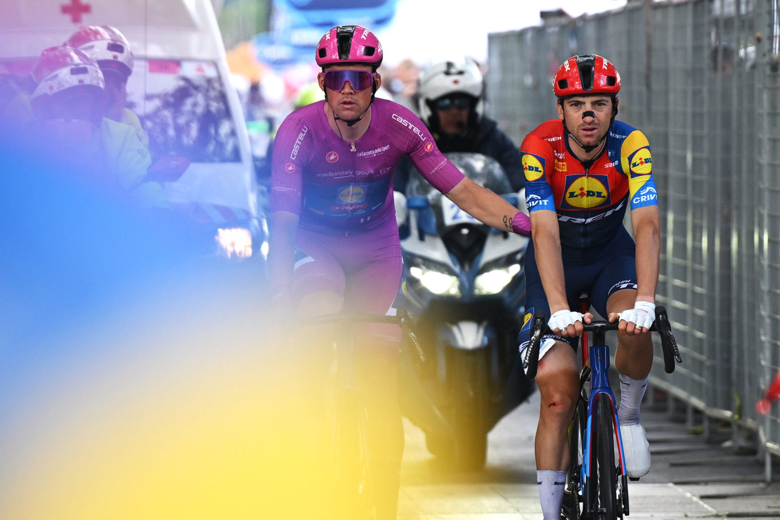 After Giulio Ciccone crashed hard on Stage 14, the whole team rallied to get him across the line safely. | Photo by Dario Belingheri/Getty Images