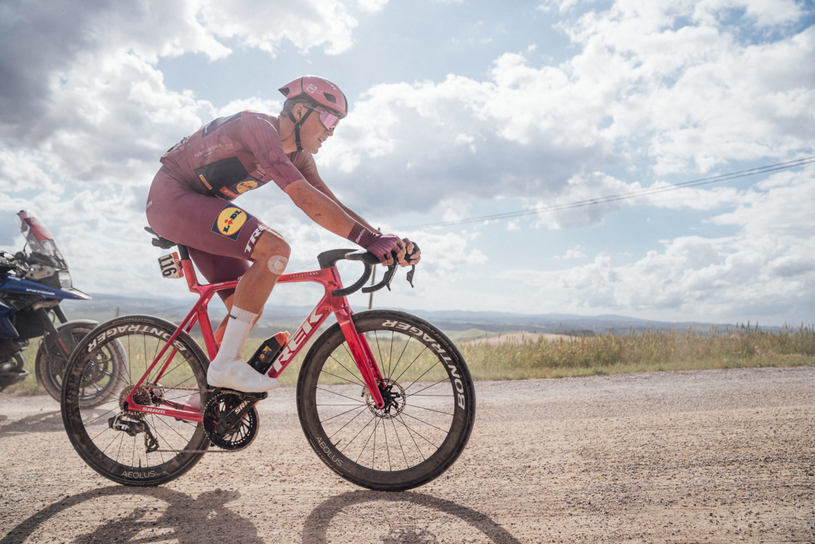 Gliding across the strade bianche in the Ciclamino jersey.