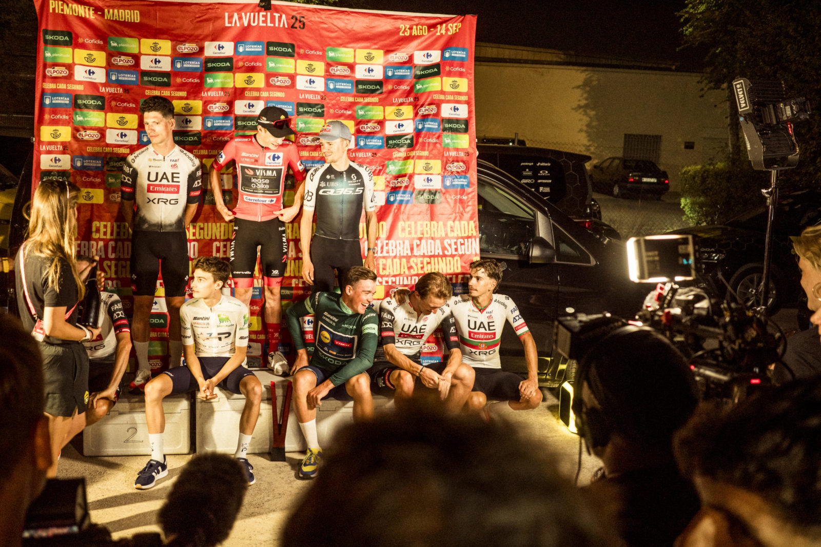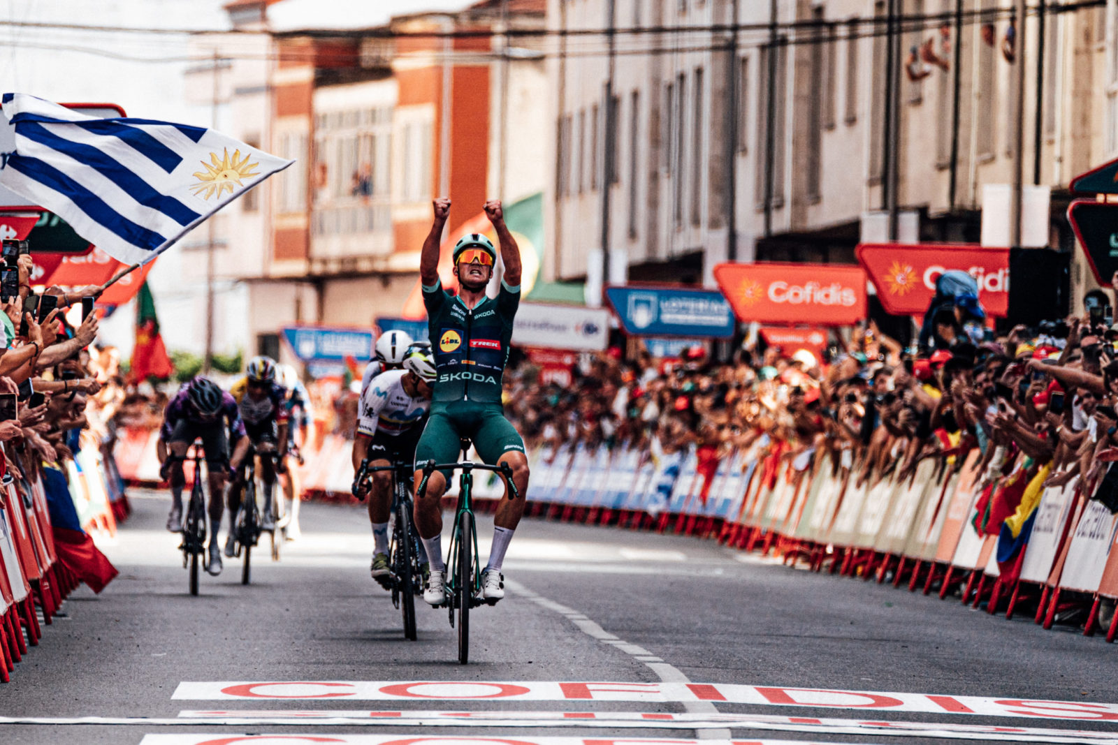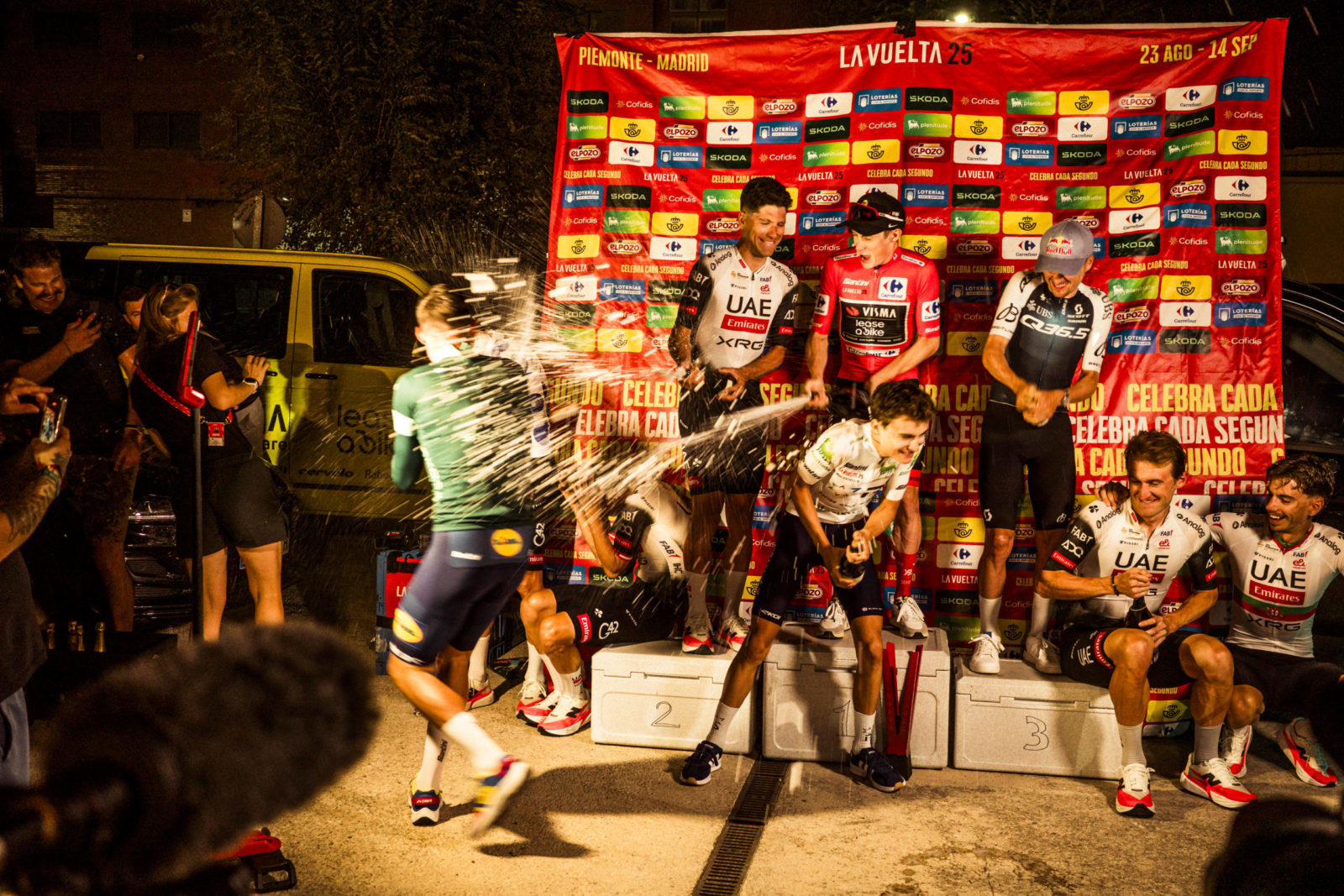 Mads Pedersen being feted after winning Stage 15 of this year's Vuelta. | Photo: Dario Belingheri/Getty Images