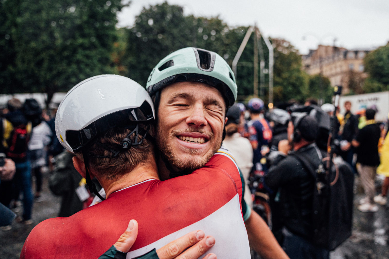 Jonny Milan and Toms Skujiņš riding arm-in-arm on Stage 21 of the Tour de France. | Photo: Zac Williams