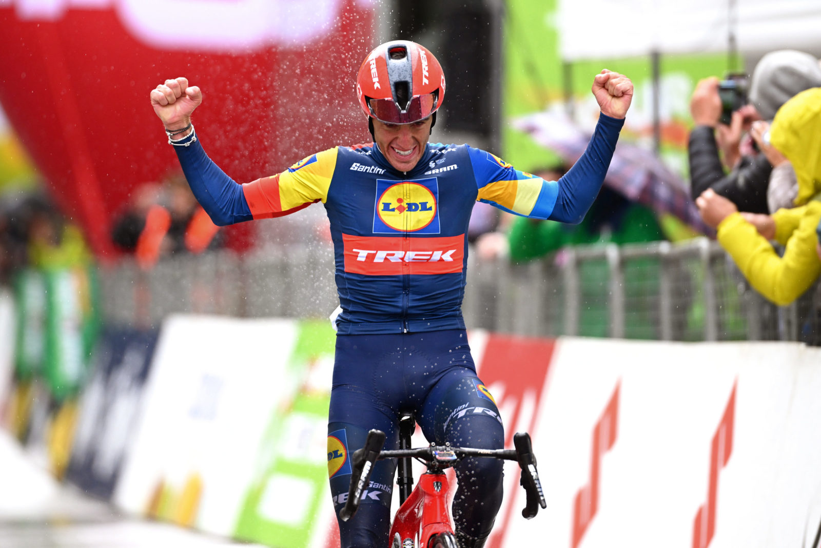 Juan Pedro López claimed his first win as a professional rider after an impressive attack at 26km from the finish. He joined Giulio Pellizzari as the duo climbed and descended through unabating rain and low temperatures as they gained on the peloton.