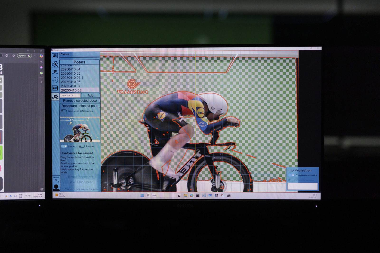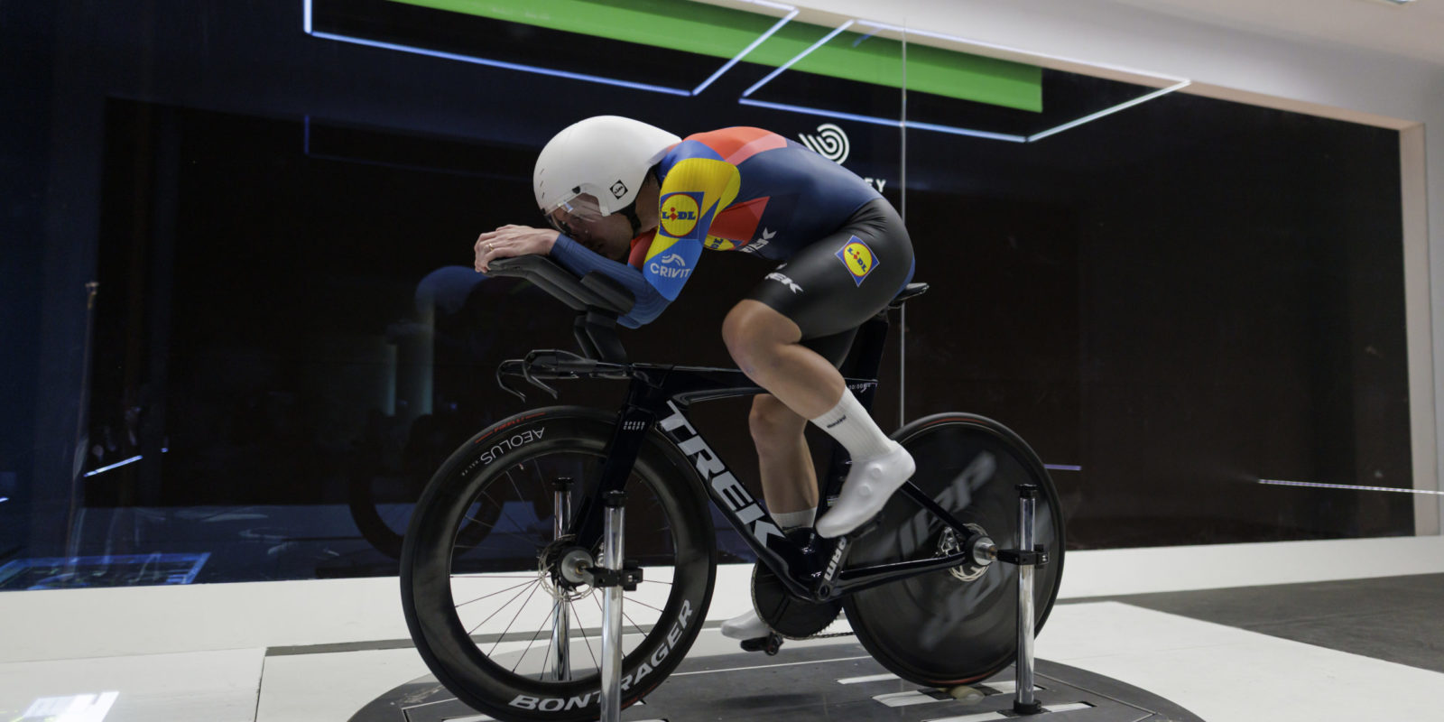Step 1 was to find the right fabric. Santini provided Lidl-Trek with as many fabric options as they could gather, which were then tested in a small-diameter wind tunnel under turbulent conditions that simulated real world racing. Based on the results, Santini made full-body skinsuits for even more wind tunnel testing — a total of seven days for Round 2. Then Lidl-Trek validated the results with velodrome testing.