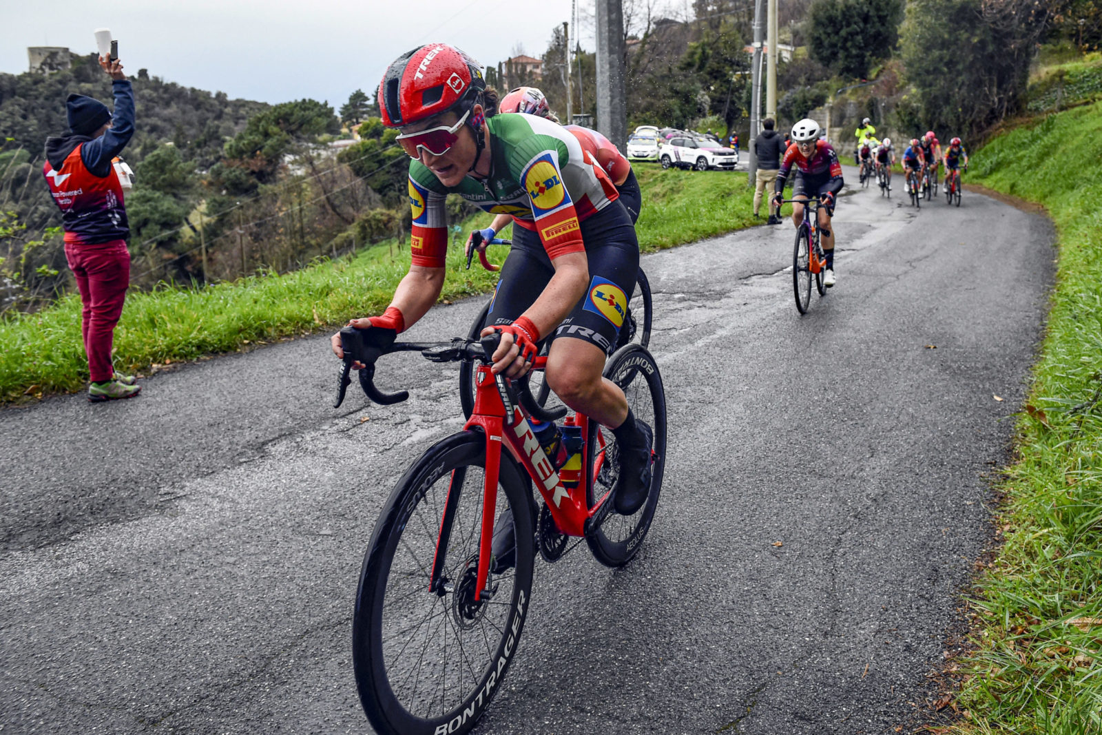 The day after finishing on the podium at Strade Bianche, the Italian champion takes a solo win in the Italian one-day race after tough day.