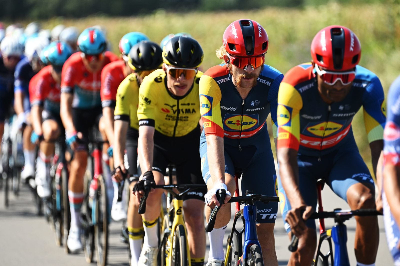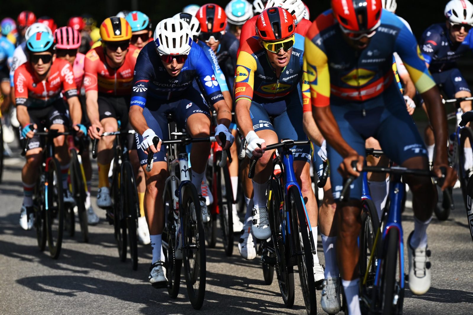 SCHIFFLANGE, LUXEMBOURG - SEPTEMBER 19: Julien Bernard of France and Team Lidl-Trek leads the peloton during the 84th Tour de Luxembourg 2024 - Stage 2 a 155km stage from Junglinster to Schifflange / #UCIWT / on September 19, 2024 in Schifflange, Luxembourg. (Photo by Tim de Waele/Getty Images)