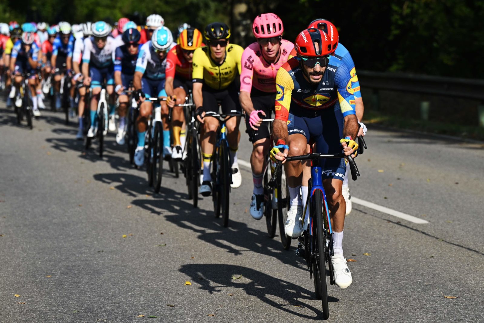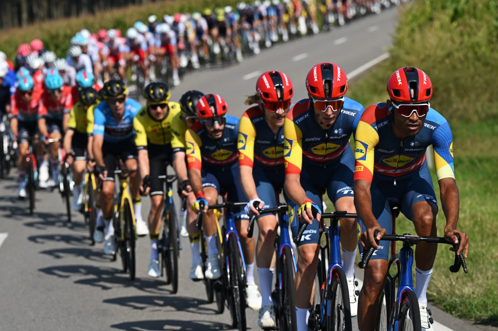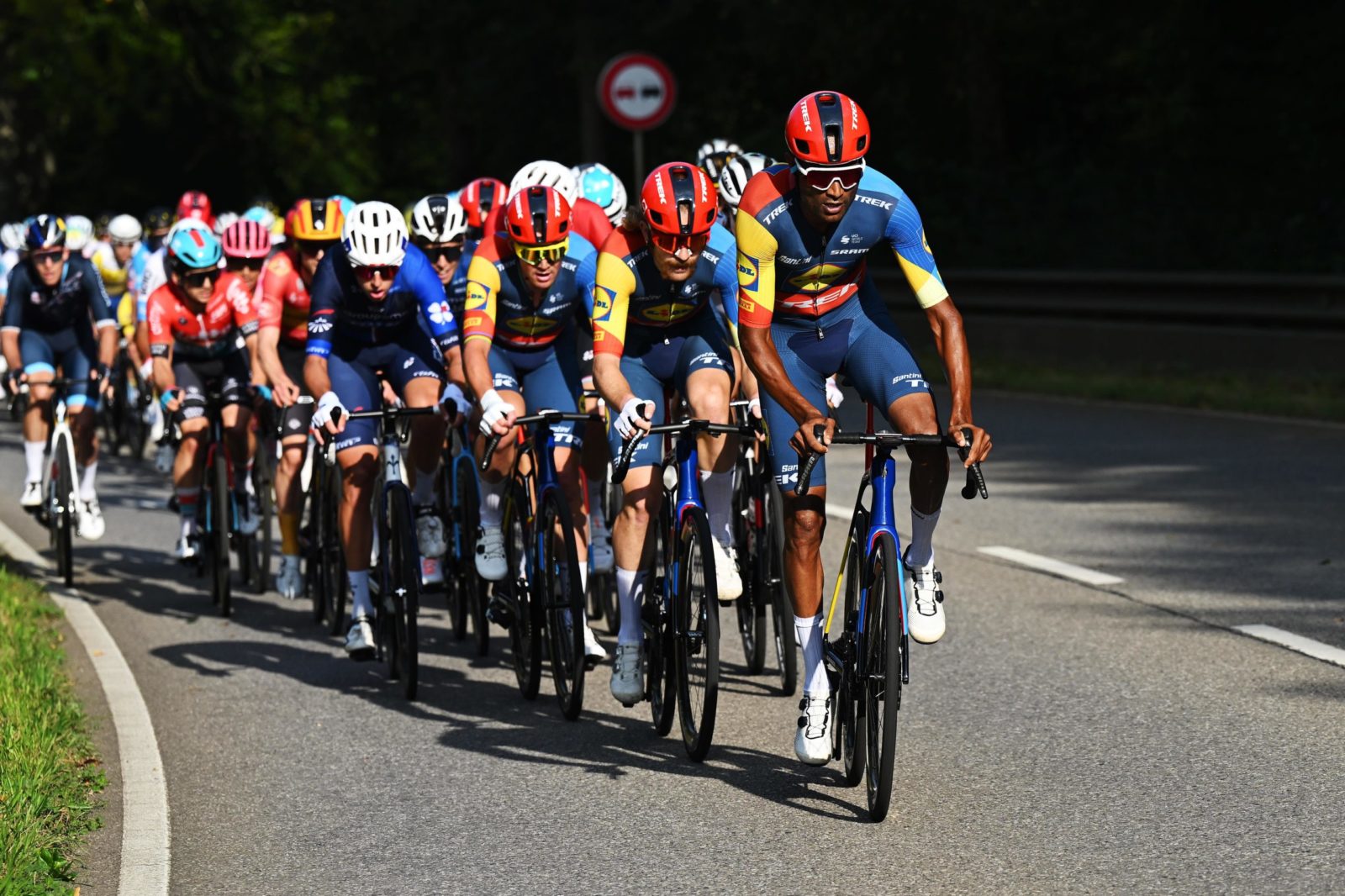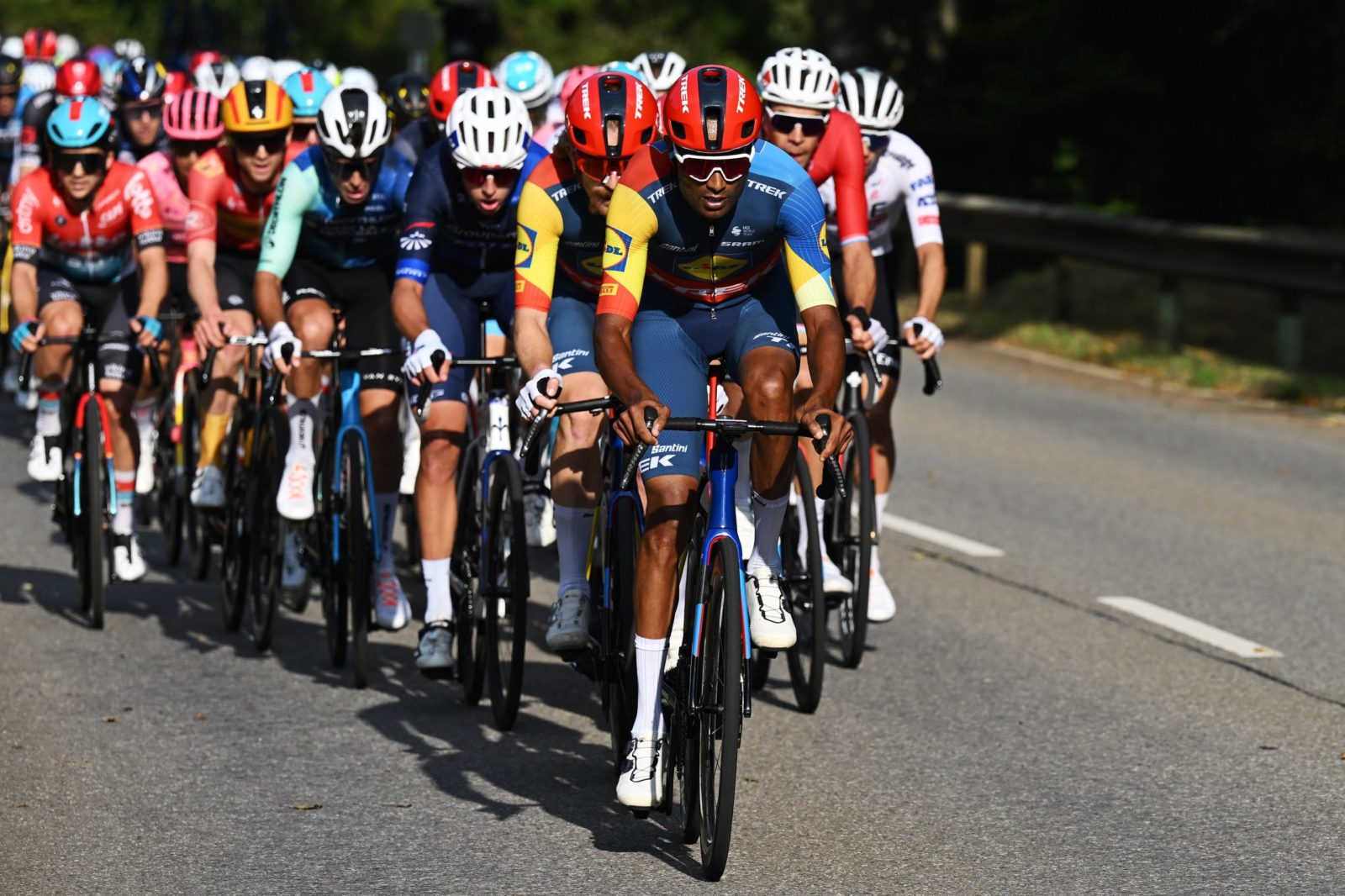 SCHIFFLANGE, LUXEMBOURG - SEPTEMBER 19: Amanuel Ghebreigzabhier of Eritrea and Team Lidl-Trek leads the peloton during the 84th Tour de Luxembourg 2024 - Stage 2 a 155km stage from Junglinster to Schifflange / #UCIWT / on September 19, 2024 in Schifflange, Luxembourg. (Photo by Tim de Waele/Getty Images)