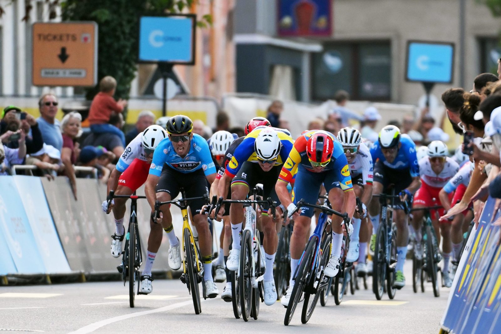SCHIFFLANGE, LUXEMBOURG - SEPTEMBER 19: (L-R) Christophe Laporte of France and Team Visma | Lease A Bike -Blue Sprint Jersey, Mathieu Van Der Poel of The Netherlands and Team Alpecin-Deceuninck - Yellow leader jersey and Mads Pedersen of Denmark and Team Lidl-Trek sprint at finish line during the 84th Tour de Luxembourg 2024 - Stage 2 a 155km stage from Junglinster to Schifflange / #UCIWT / on September 19, 2024 in Schifflange, Luxembourg. (Photo by Tim de Waele/Getty Images)