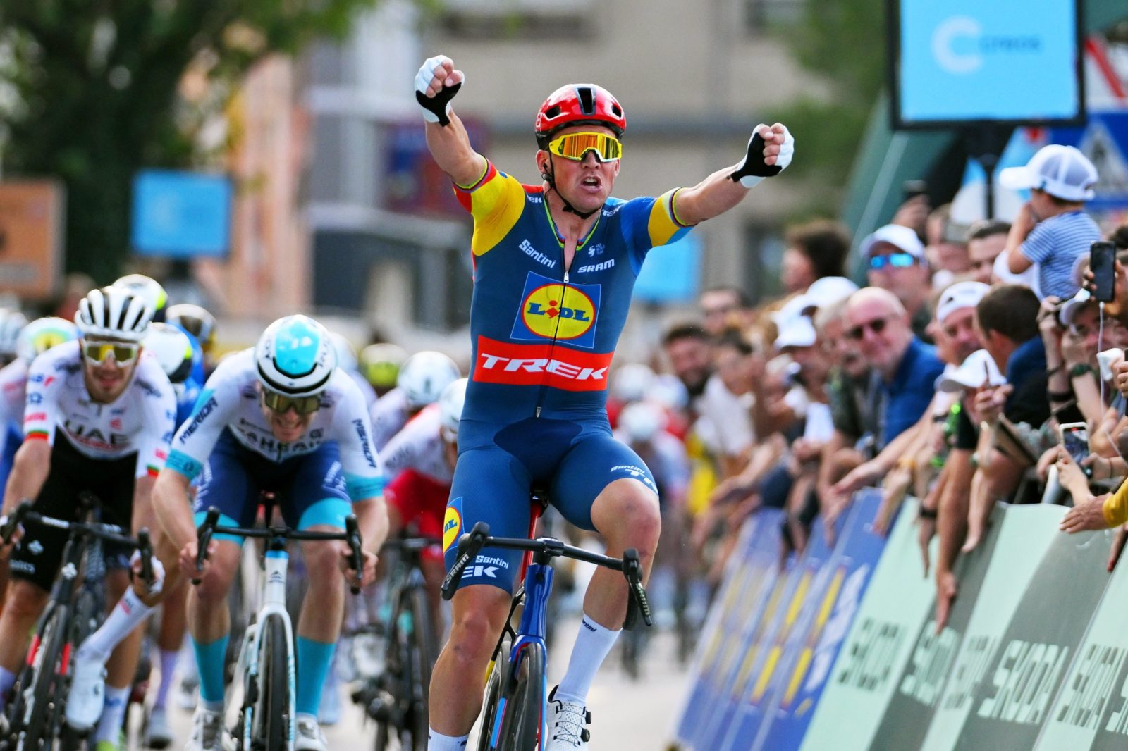Mads Pedersen’s incredible season continues with yet another victory, marking his 12th win of the year. In today’s second stage of the Tour de Luxembourg (Junglinster – Schifflange), Mads dominated the sprint, beating world champion Van der Poel (Alpecin-Deceuninck) and Swiss rider Froidevaux (Tudor).
