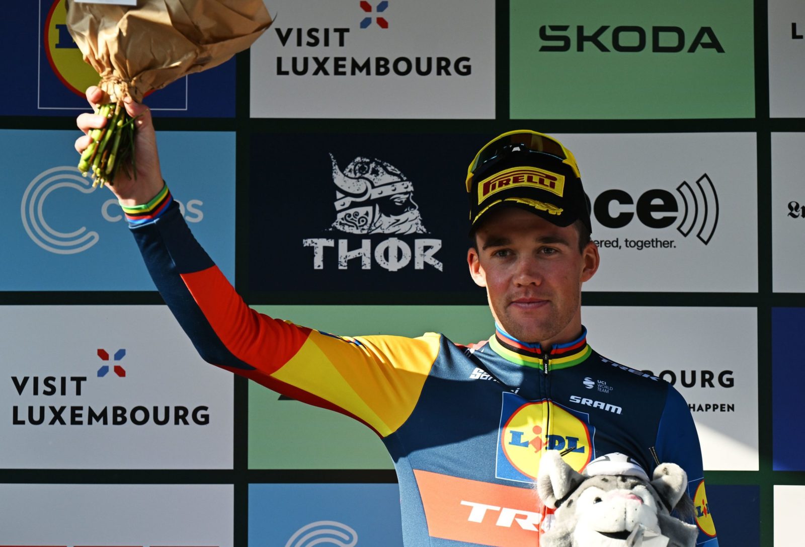 SCHIFFLANGE, LUXEMBOURG - SEPTEMBER 19: Mads Pedersen of Denmark and Team Lidl-Trek celebrates at podium as stage winner during the 84th Tour de Luxembourg 2024 - Stage 2 a 155km stage from Junglinster to Schifflange / #UCIWT / on September 19, 2024 in Schifflange, Luxembourg. (Photo by Tim de Waele/Getty Images)