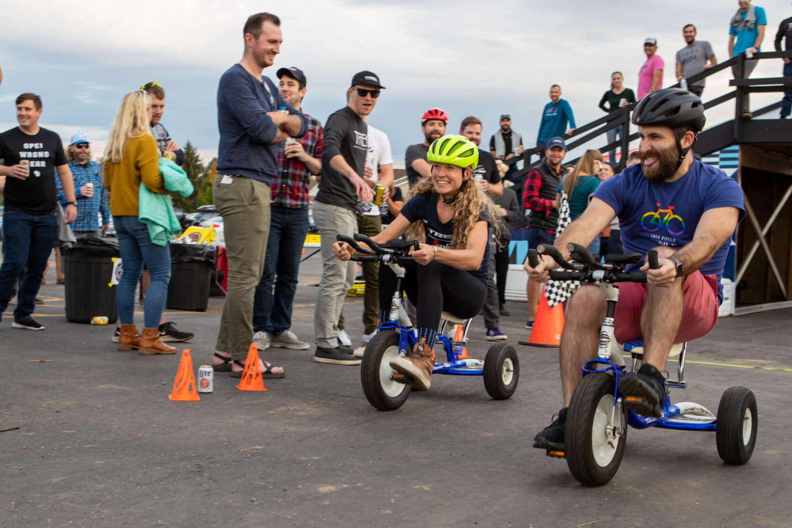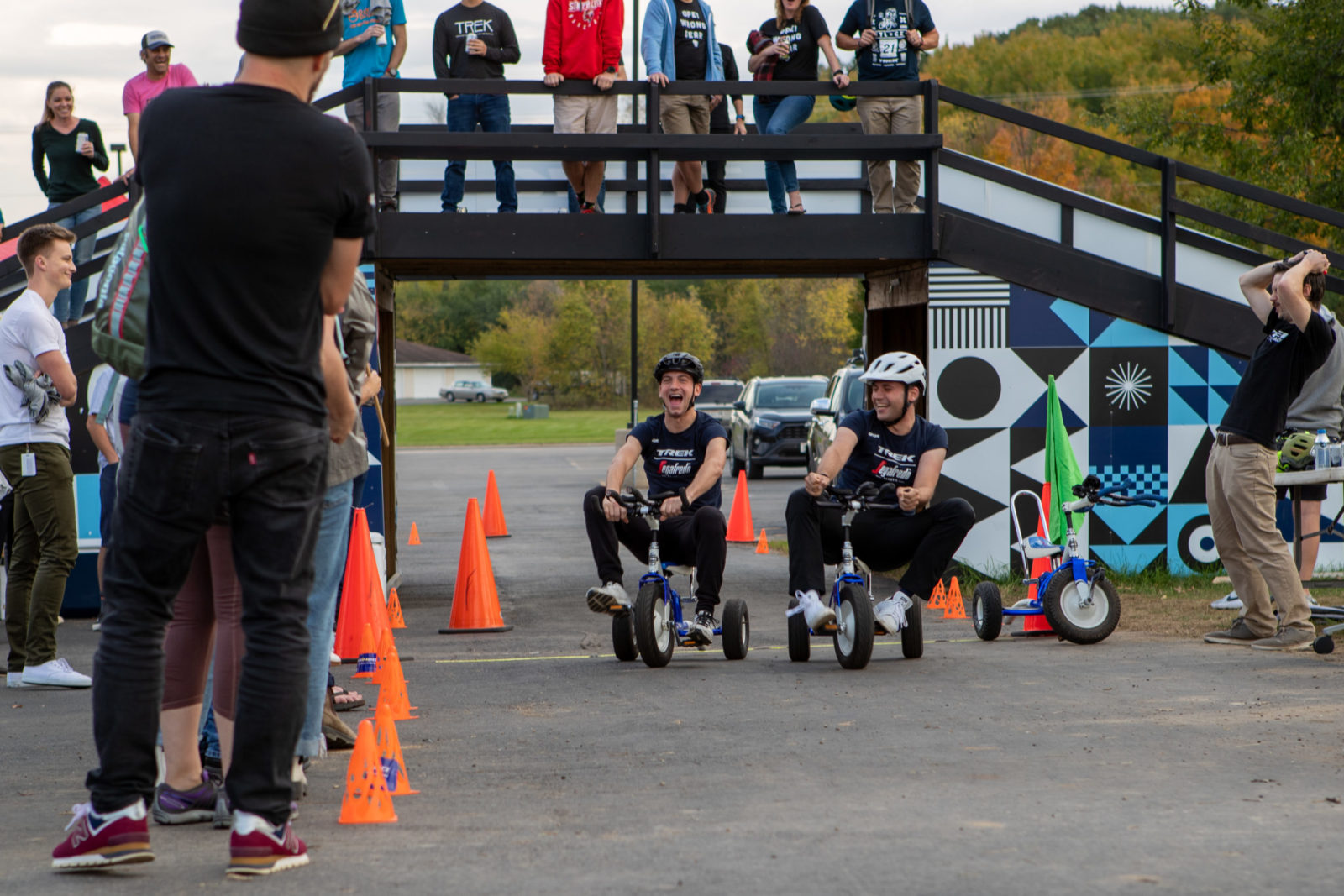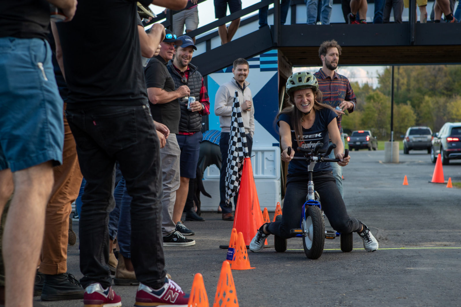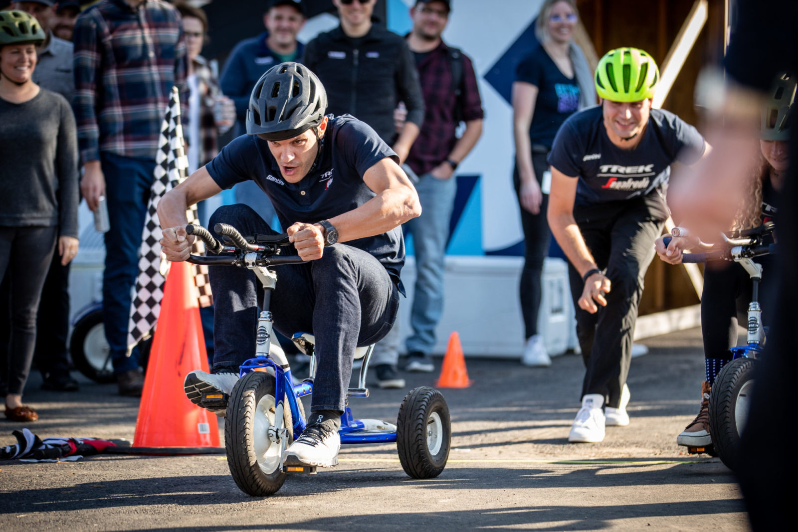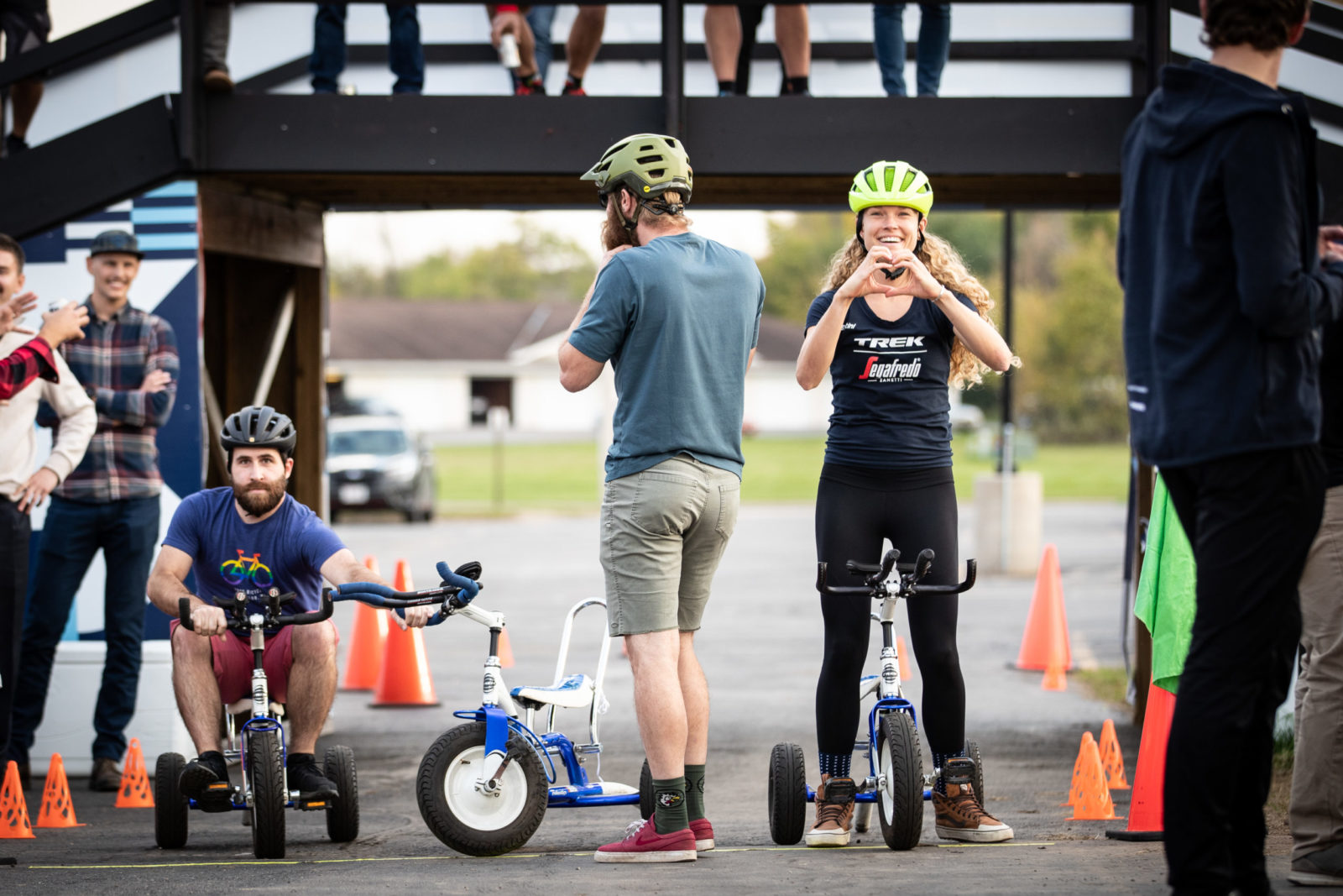 Our whistle-stop tour continued with a trip to Trek HQ in Waterloo, Wisc. where we had a full schedule. Jasper, Lizzie and co. had an early wake up to play some ice hockey session at the local Wisconsin Hockey Club before plenty of photoshoots for our new 2022 riding kits. The radioactive coral kit is our hi-vis outfit for training at home, and you’ll have to patiently wait to see what the designers at Trek concocted and our partner Santini brought to life. Next, there was more product feedback with the Trek engineers to help make our fast bikes even faster. The finale of our Trek visit was an all-in trike racing tournament, Trike Factory Racing.