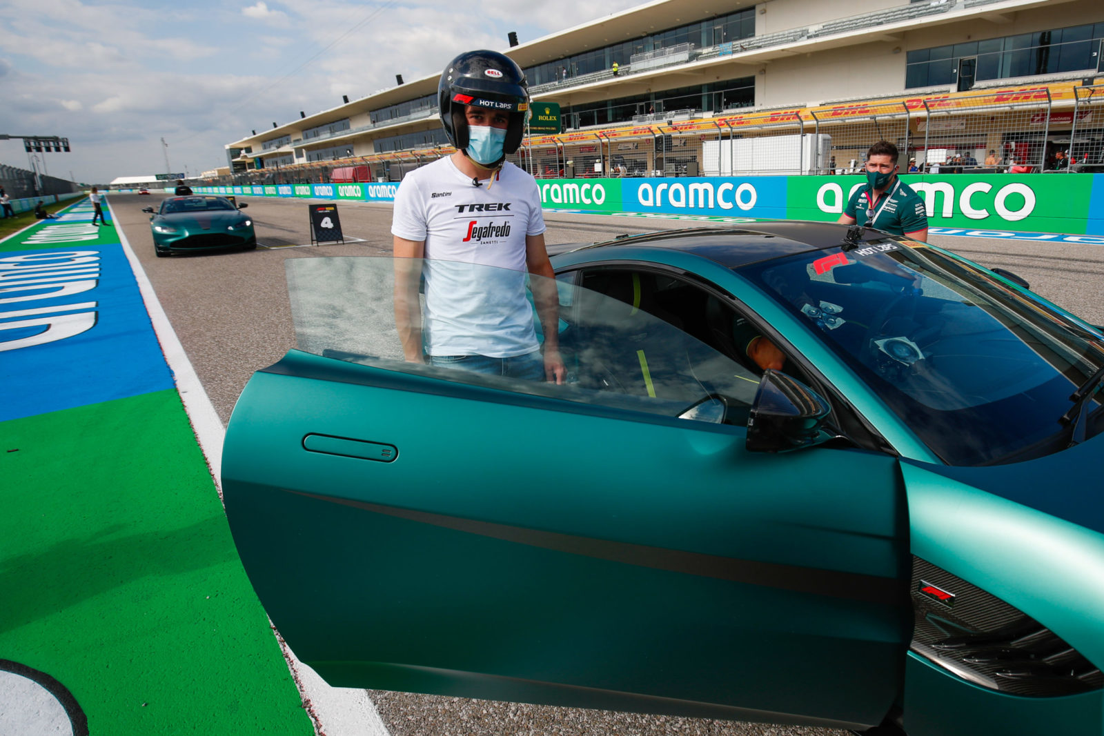 Mads Pedersen and Elisa Longo Borghini extended their visit with a trip to the Formula 1 Austin Grand Prix at the Circuit of the Americas to celebrate the great news of our upgraded partnership with Pirelli, who provide race-winning tires to our Team as well as most Formula 1 teams. After riding a lap of honor aboard their own Trek bikes, Mads and Elisa were welcomed into a supercar to experience a ‘Hot Lap’. Who else is jealous?