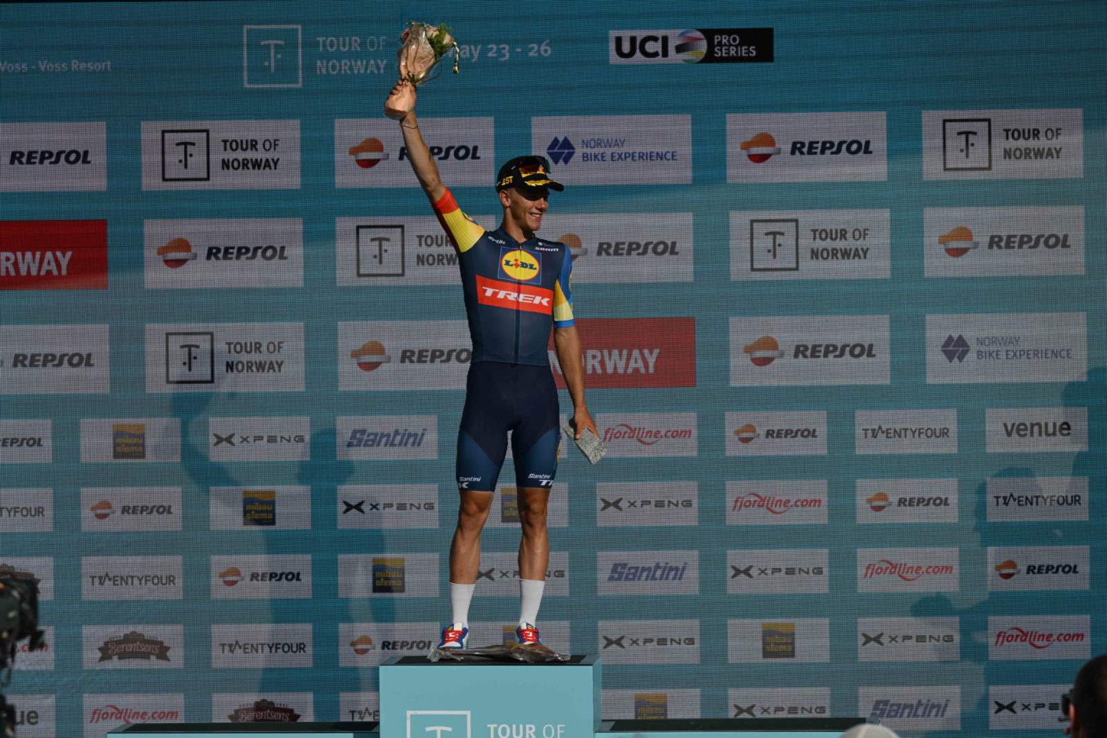 The first stage of the four day race took the peloton on a 142km loop around the Norwegian fjords, starting and finishing in Voss. With Nys showing such strong form ahead of the race, a natural responsibility to control the breakaway fell to Lidl-Trek, which required a big effort from the team: Dario Cataldo, Fabio Felline, and Natnael Tesfazion.