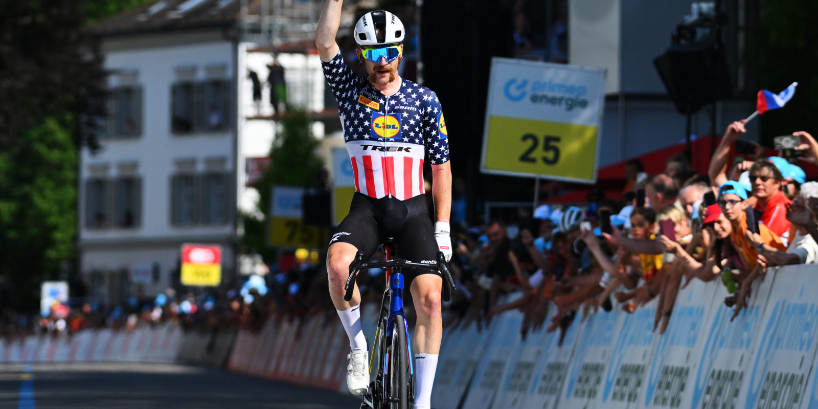 Simmons powered through the undulating terrain alone, using his time-trialing strength and descending skills to hold a 30-second advantage. The peloton organized a chase behind, but they couldn’t reel him in. He crossed the line flying like an eagle, punching the air and pointing to the sky in tribute to the late Gino Mäder.