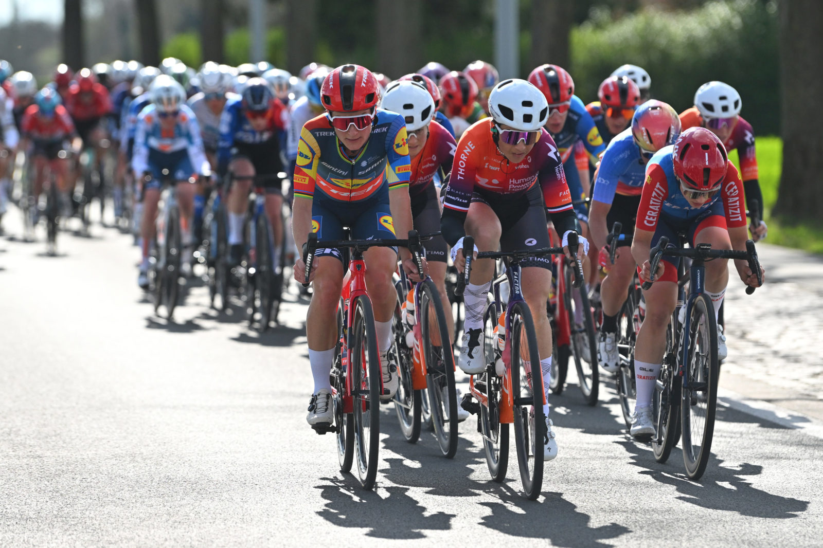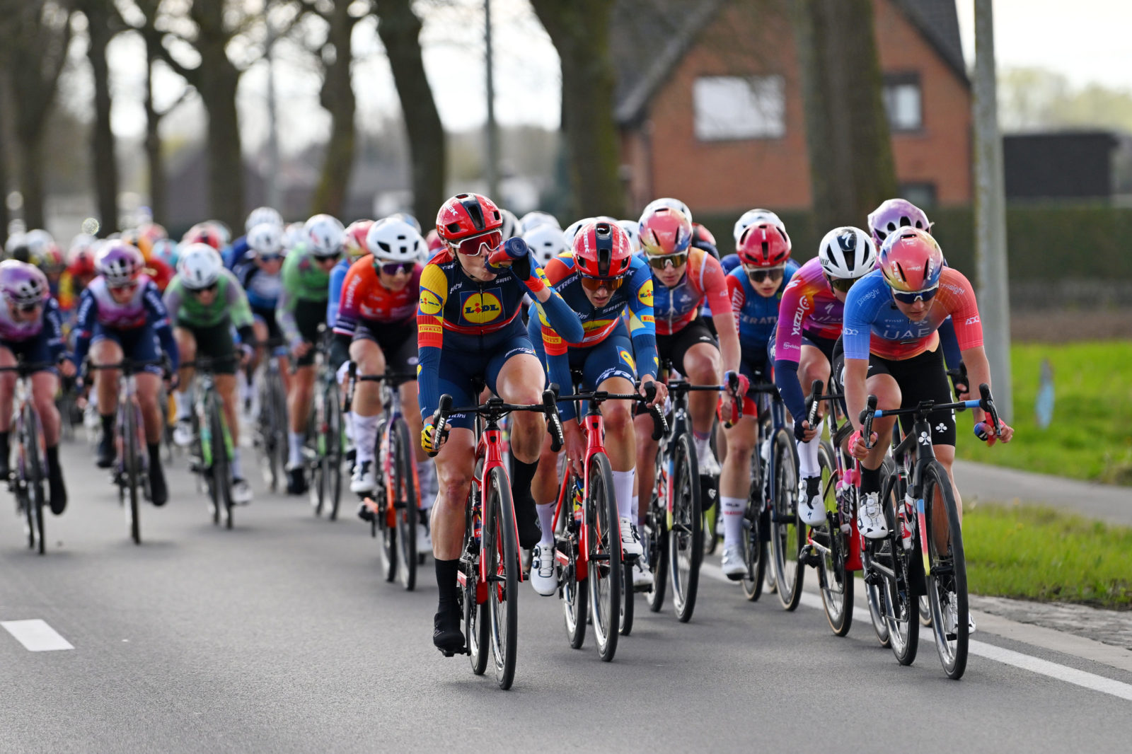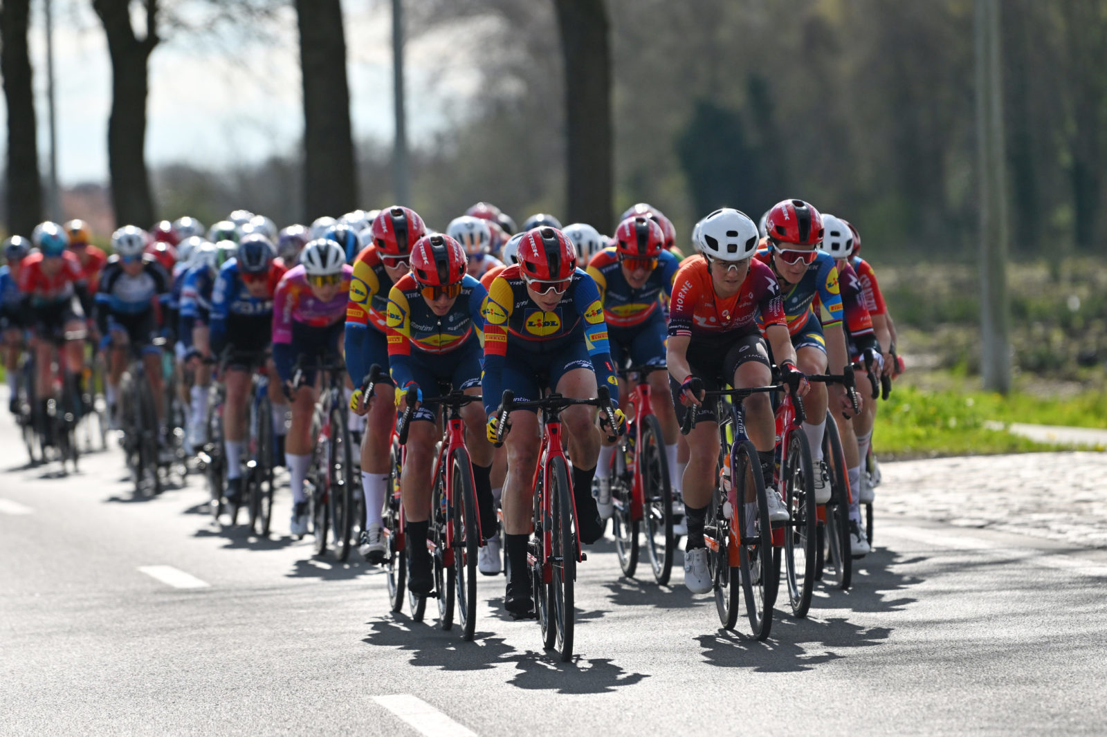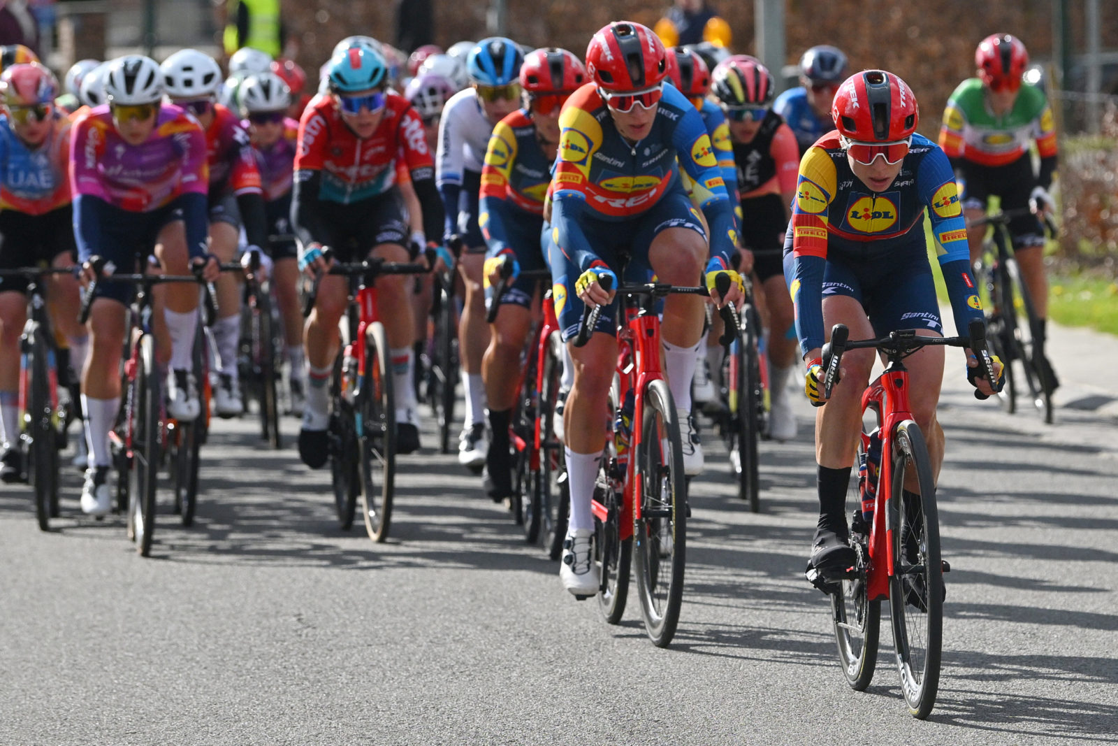 WAREGEM, BELGIUM - MARCH 27: Lucinda Brand of The Netherlands and Team Lidl - Trek and the women's peloton is stopped due to a two-car accident after the men's race, there will be no climb of the Knokteberg - Trieu during the 12nd Dwars door Vlaanderen 2024, Women's Elite a 129.9km one day race from Waregem to Waregem on March 27, 2024 in Waregem, Belgium. (Photo by Luc Claessen/Getty Images)