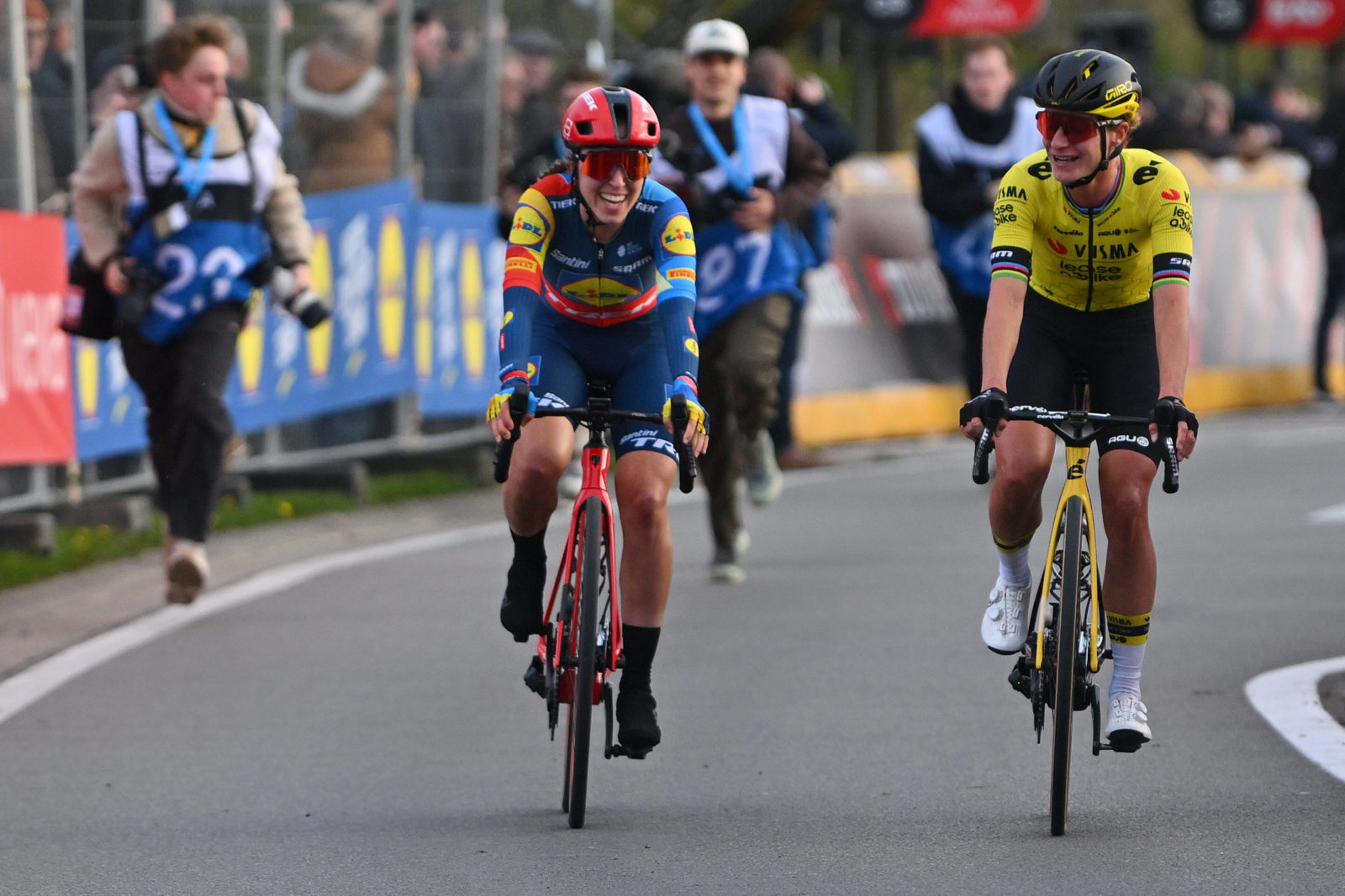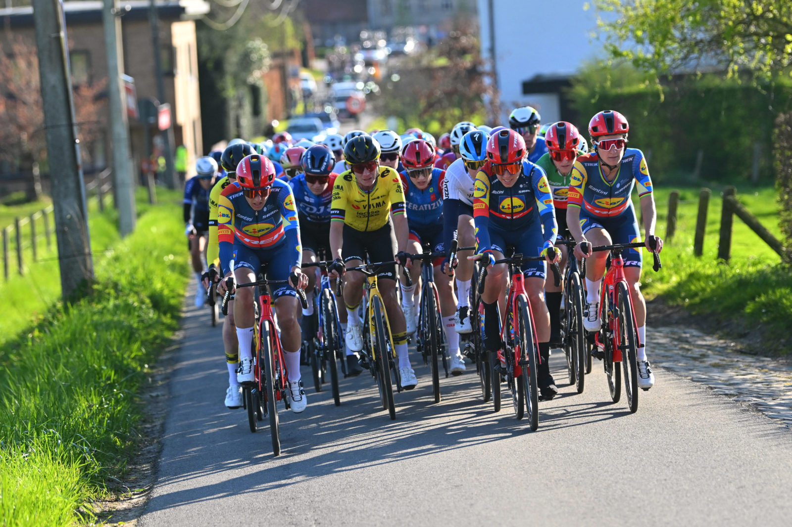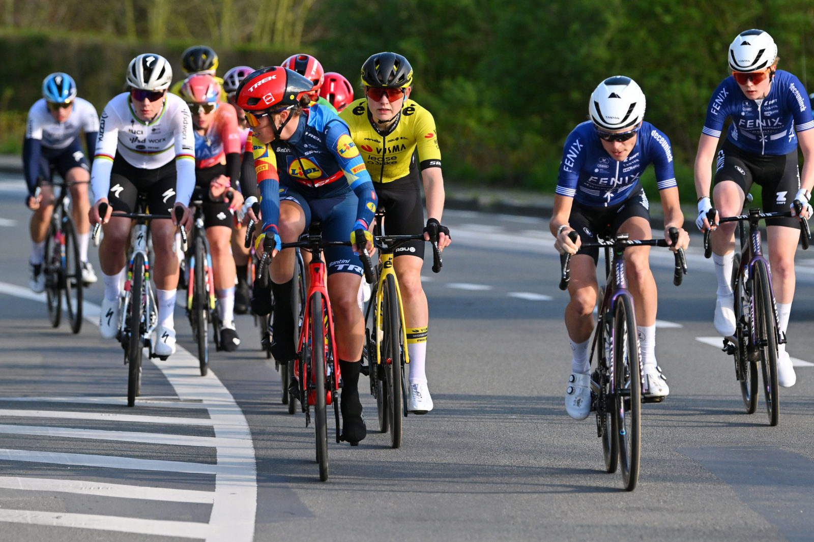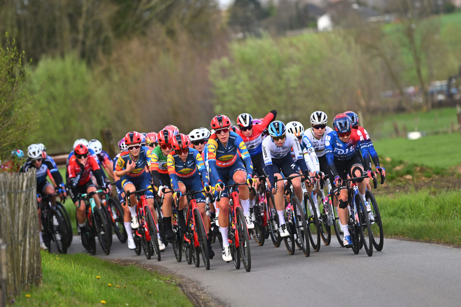 WAREGEM, BELGIUM - MARCH 27: Lucinda Brand of The Netherlands and Team Lidl - Trek and the women's peloton is stopped due to a two-car accident after the men's race, there will be no climb of the Knokteberg - Trieu during the 12nd Dwars door Vlaanderen 2024, Women's Elite a 129.9km one day race from Waregem to Waregem on March 27, 2024 in Waregem, Belgium. (Photo by Luc Claessen/Getty Images)