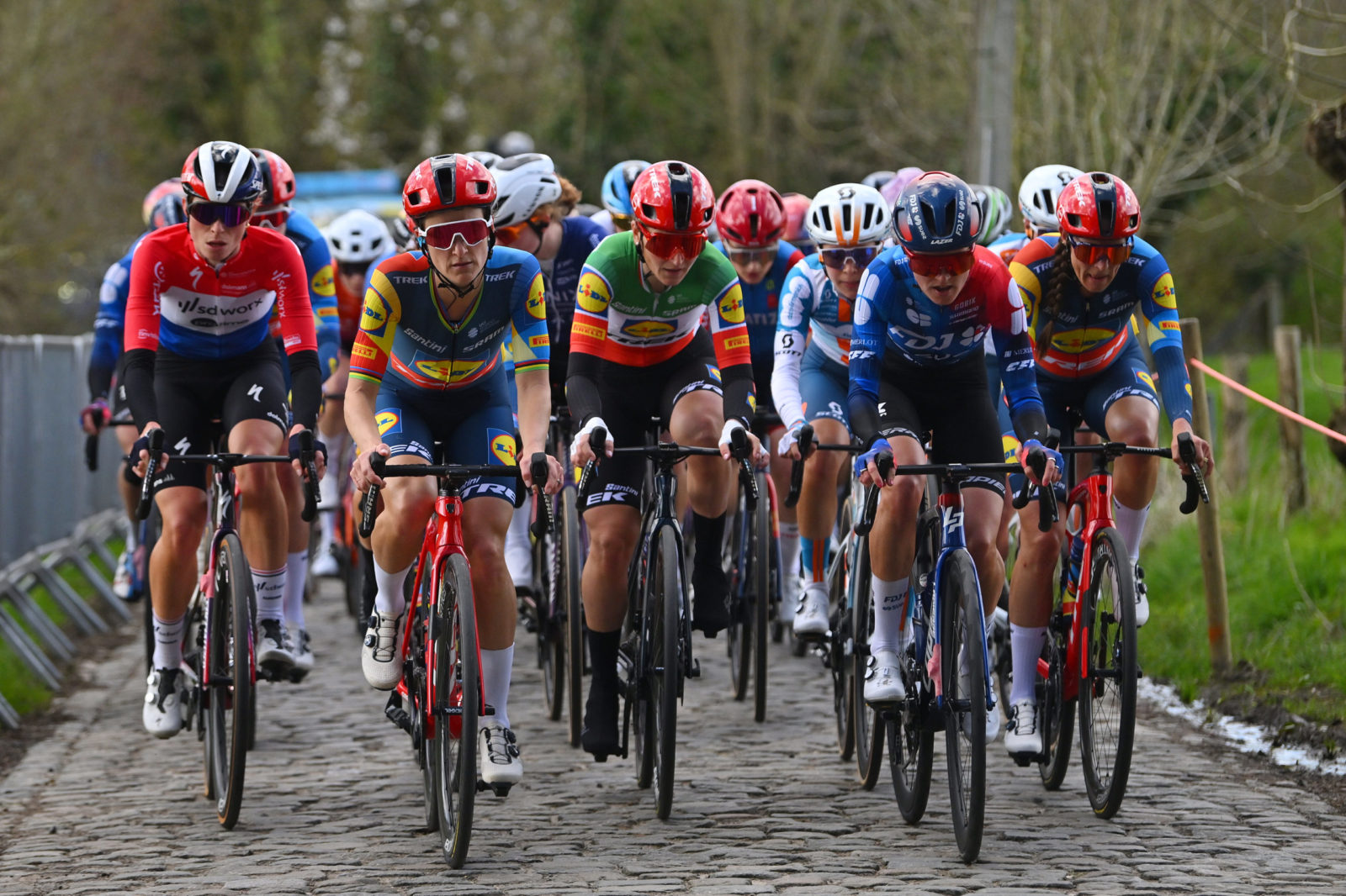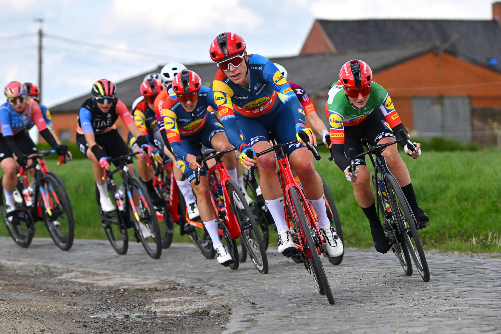 WAREGEM, BELGIUM - MARCH 27: (L-R) Demi Vollering of The Netherlands and Team SD Worx - Protime, Elizabeth Deignan of Great Britain and Team Lidl - Trek, Elisa Longo Borghini of Italy and Team Lidl - Trek, Nina Buljsman of The Netherlands and Team FDJ - SUEZ and Lucinda Brand of The Netherlands and Team Lidl - Trek compete passing through a Berg Ten Houte cobblestones sector during the 12nd Dwars door Vlaanderen 2024, Women's Elite a 129.9km one day race from Waregem to Waregem on March 27, 2024 in Waregem, Belgium. (Photo by Luc Claessen/Getty Images)