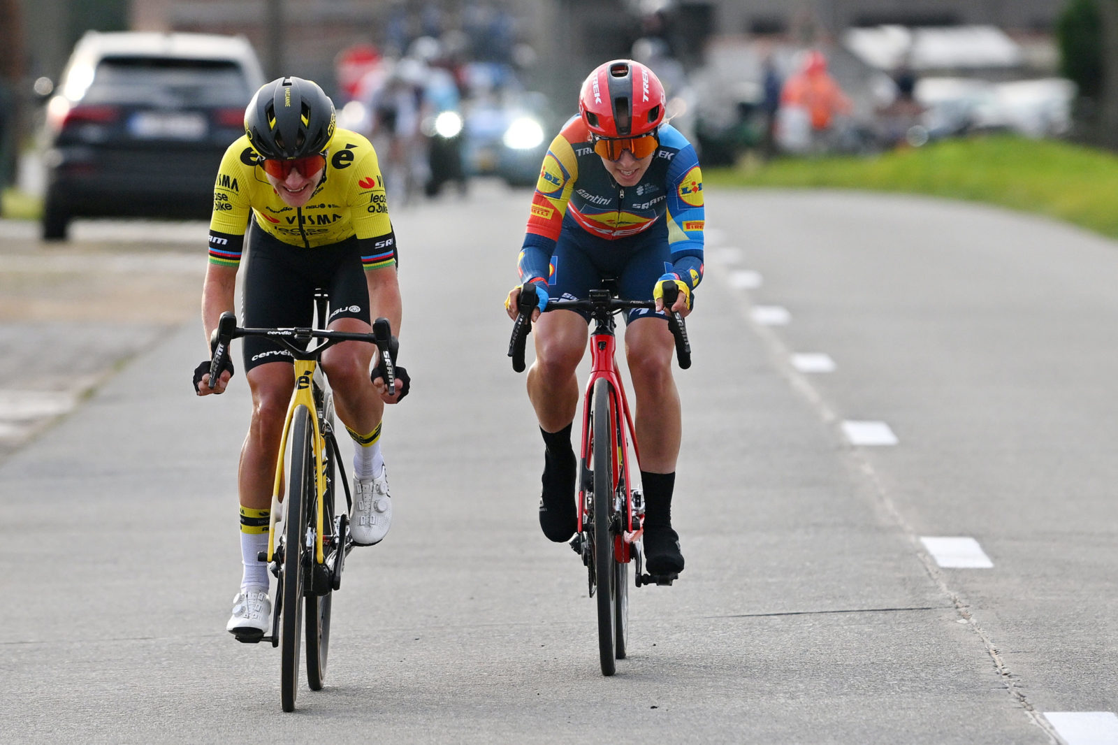 WAREGEM, BELGIUM - MARCH 27: (L-R) Marianne Vos of The Netherlands and Team Visma-Lease a Bike and Shirin van Anrooij of The Netherlands and Team Lidl - Trek attack in the breakaway during the 12nd Dwars door Vlaanderen 2024, Women's Elite a 129.9km one day race from Waregem to Waregem on March 27, 2024 in Waregem, Belgium. (Photo by Luc Claessen/Getty Images)