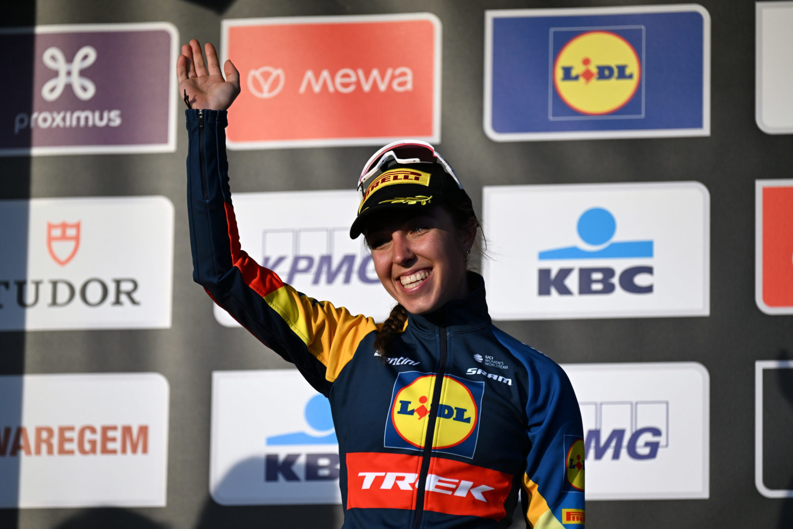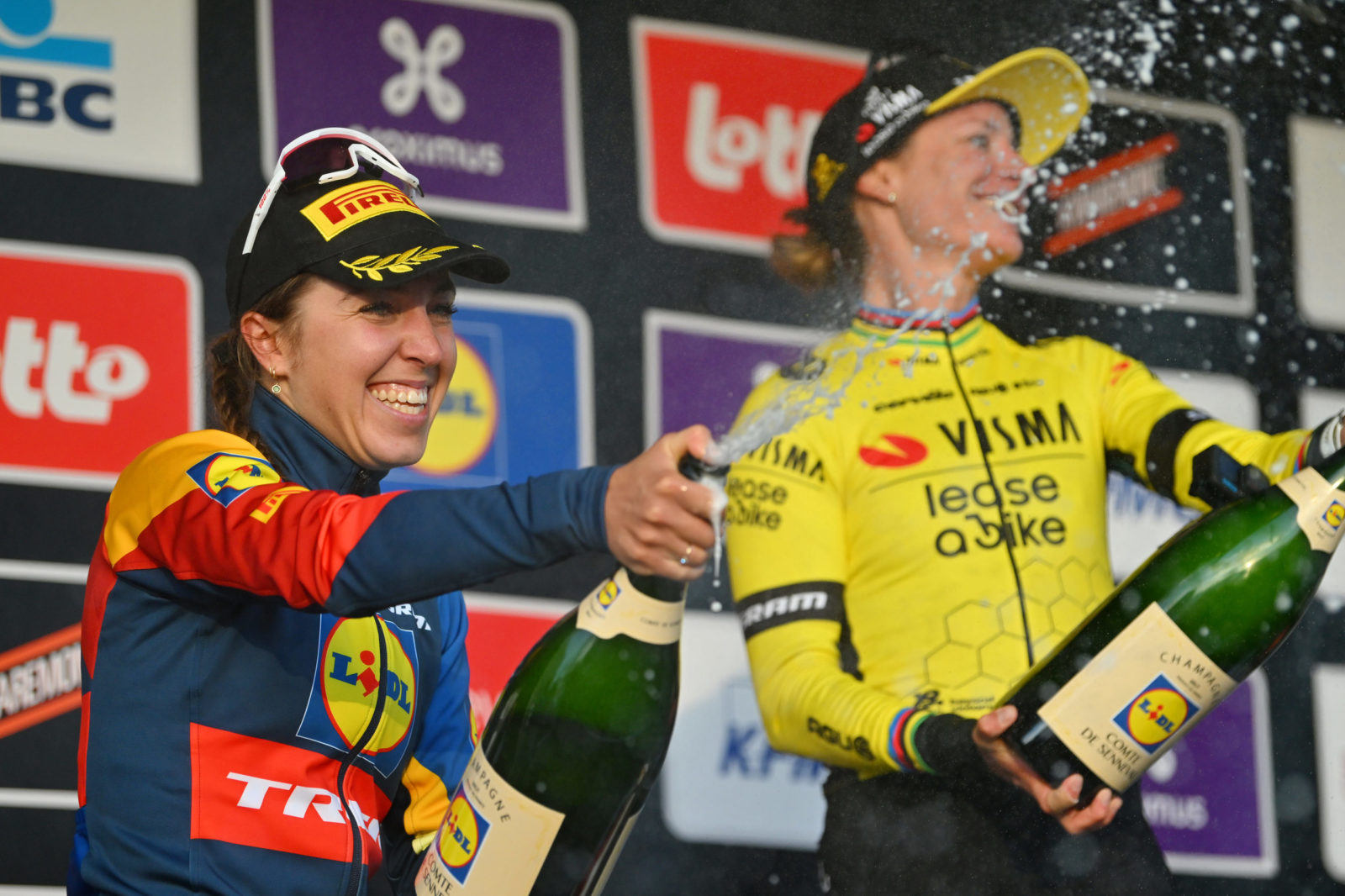 WAREGEM, BELGIUM - MARCH 27: Shirin van Anrooij of The Netherlands and Team Lidl - Trek celebrates at podium as second place winner during the 12nd Dwars door Vlaanderen 2024, Women's Elite a 129.9km one day race from Waregem to Waregem on March 27, 2024 in Waregem, Belgium. (Photo by Luc Claessen/Getty Images)