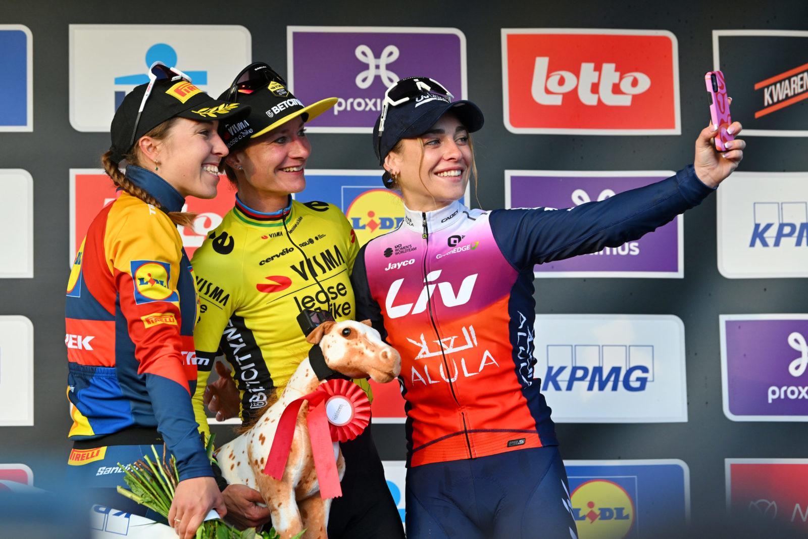 WAREGEM, BELGIUM - MARCH 27: (L-R) Shirin van Anrooij of The Netherlands and Team Lidl - Trek on second place, race winner Marianne Vos of The Netherlands and Team Visma-Lease a Bike and Letizia Paternoster of Italy and Team Liv-AlUla Jayco on third place pose for a photograph on the podium ceremony after the 12nd Dwars door Vlaanderen 2024, Women's Elite a 129.9km one day race from Waregem to Waregem on March 27, 2024 in Waregem, Belgium. (Photo by Luc Claessen/Getty Images)