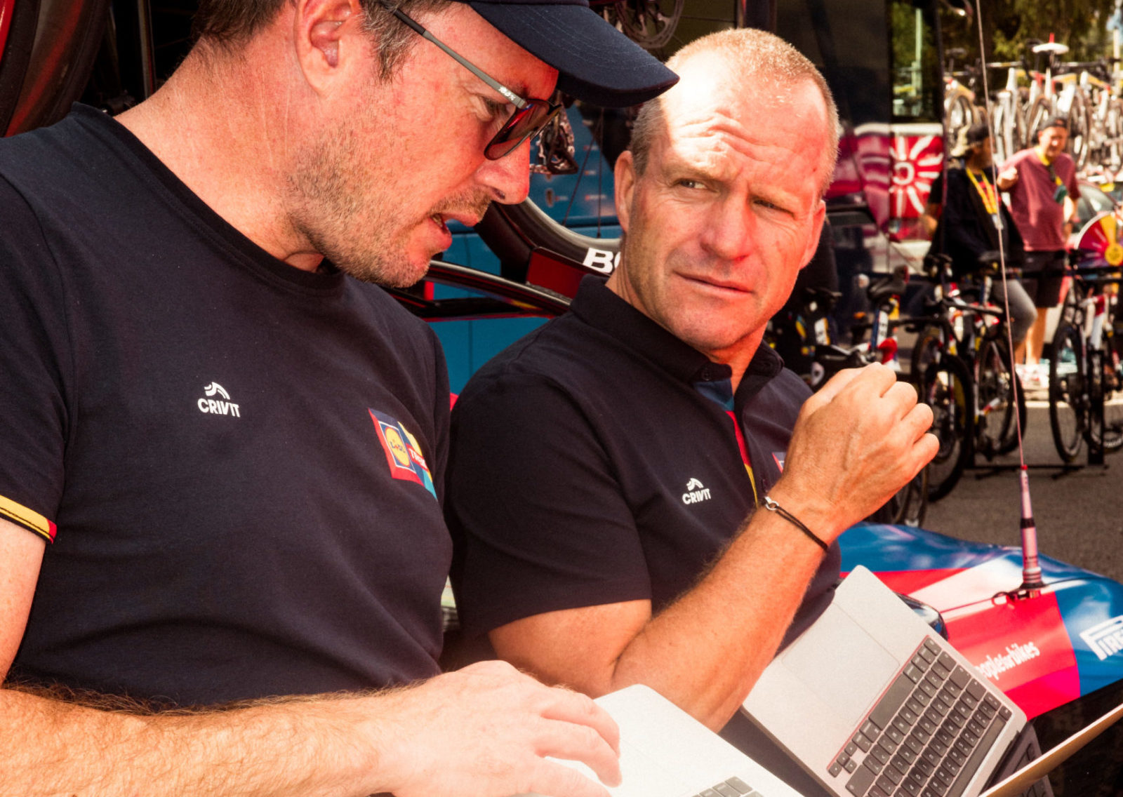 Steven de Jongh (right) game planning in the mountains with fellow sports director Grégory Rast. | Photo: Sean Hardy