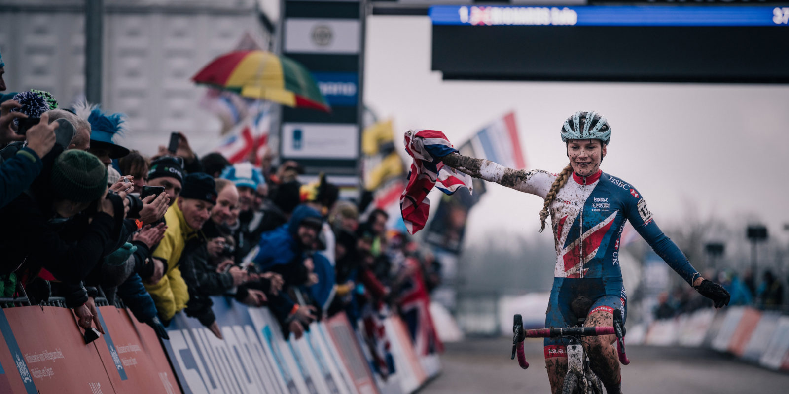 The 20-year-old British cyclist overcomes brutal muddy conditions to reclaim the rainbow jersey.