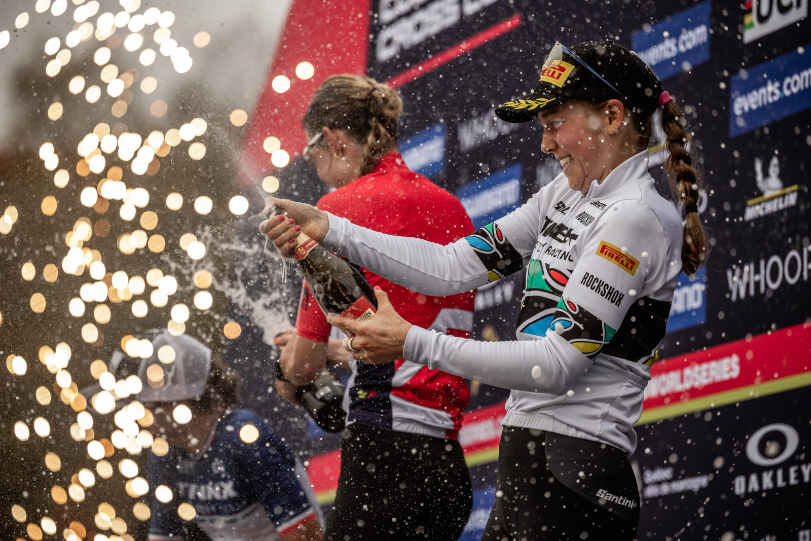 Bubbly and pyrotechnics for Madigan Munro's U23 Women's XCO third place overall finish.
