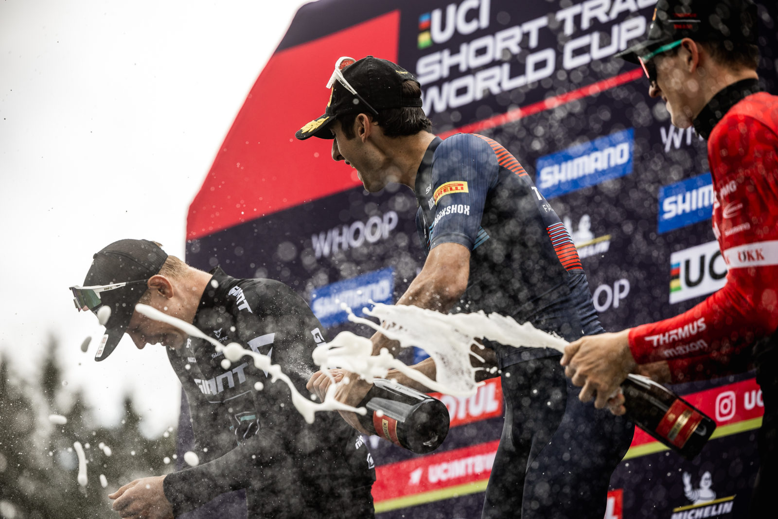 Riley Amos popping champagne atop the top step of a World Cup podium for the fifth time this season.
