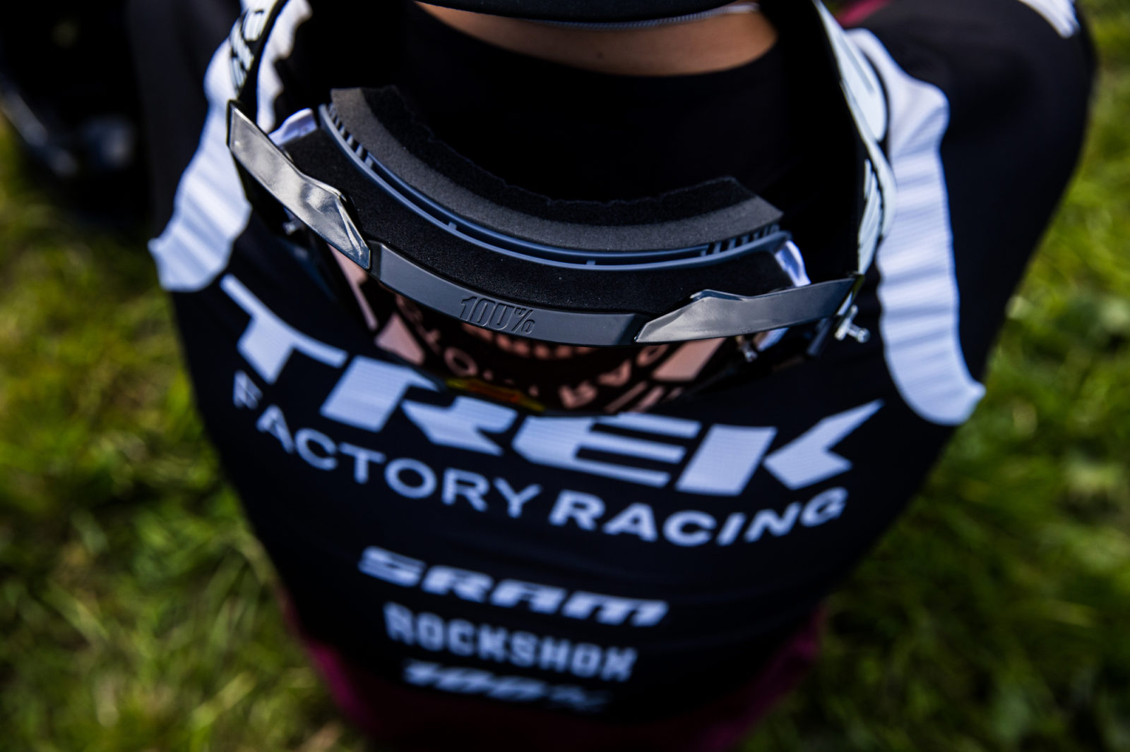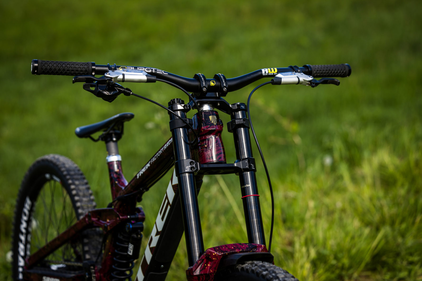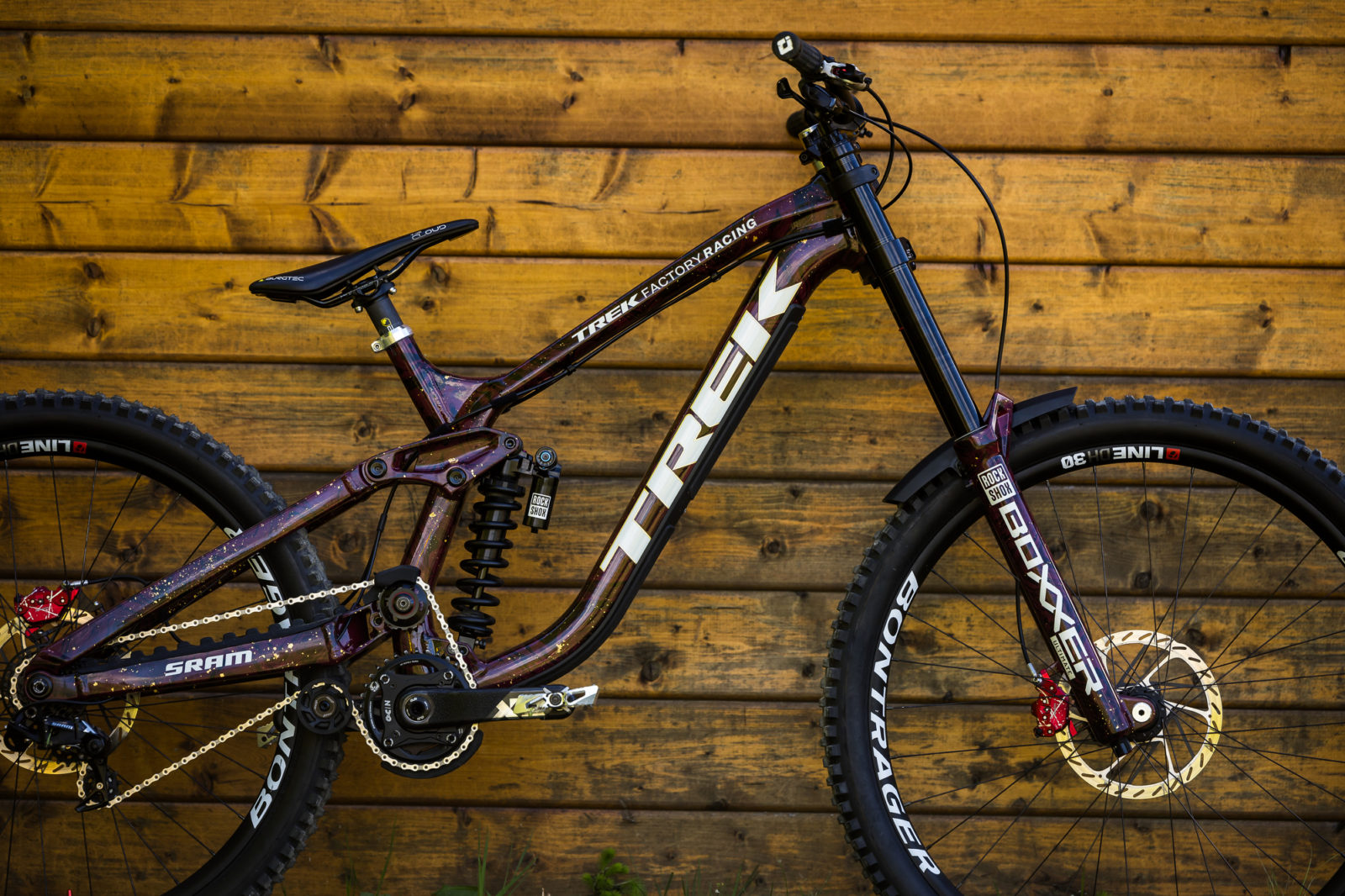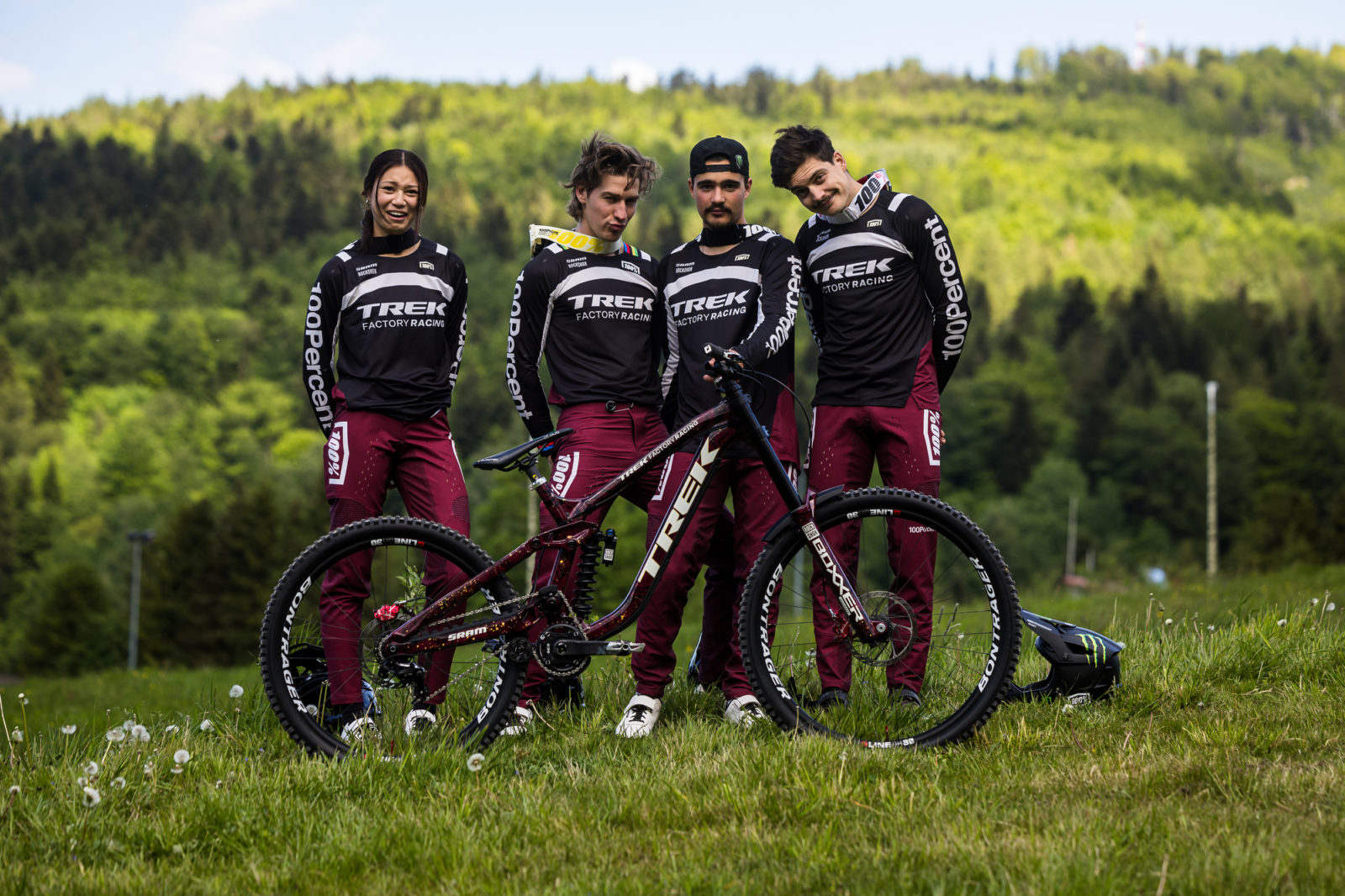 We often say that the Trek Factory Racing Downhill squad is a class act. The riders are taking that literally for a debut World Cup track in Bielsko-Biala, Poland. They’ll race on custom “Merlot” Trek Sessions, flecked with a real gold flakes, and including a matching RockShox BoXXer fork. Custom 100% kits pair beautifully, like a nice slice of aged Brie.