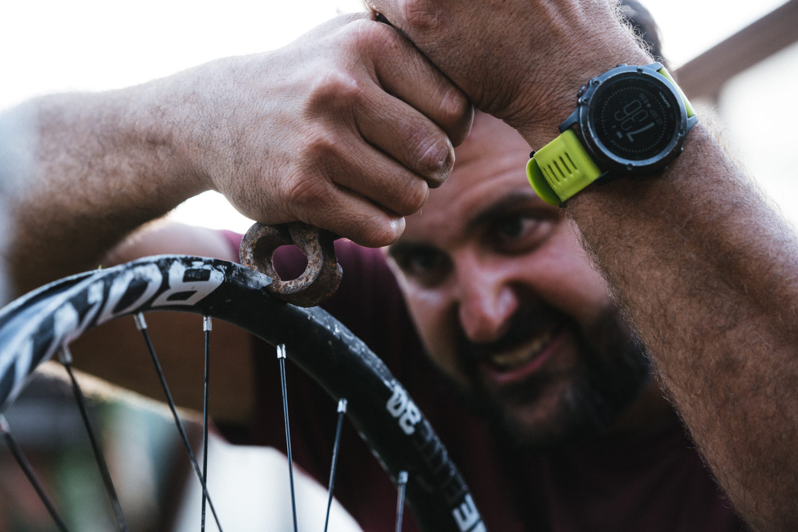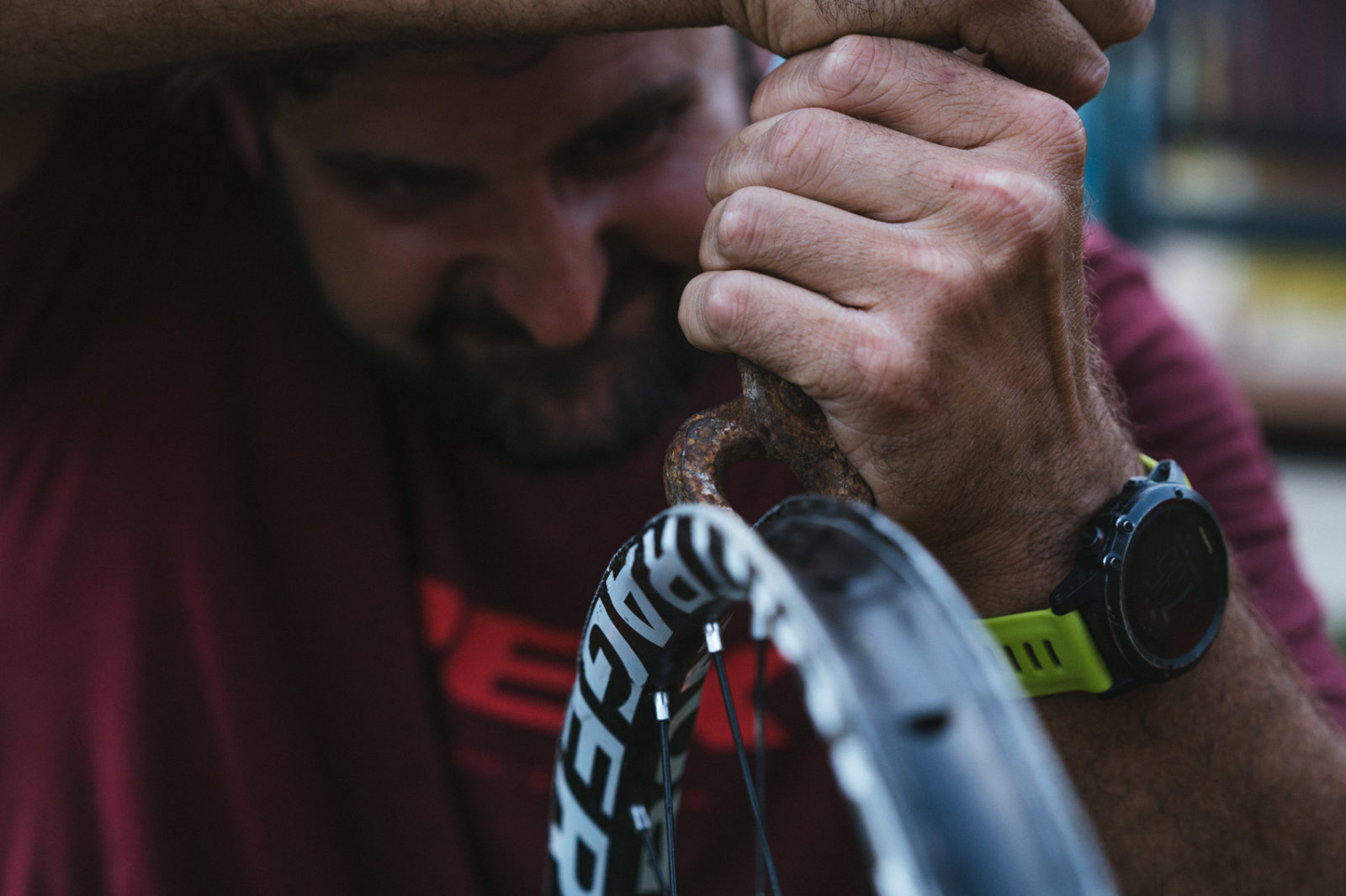 With no choice, Ruaridh slung the tire over his shoulder and pedaled back to the castle on the rim, thinking his race had gone into the bin. The rim was trashed by the time he got back, but Trek Factory Racing mechanic Tyler West wasn’t sure the game was over just yet. Out-of-the-box thinking and ingenuity prevailed; the mastermind mechanic went to work.