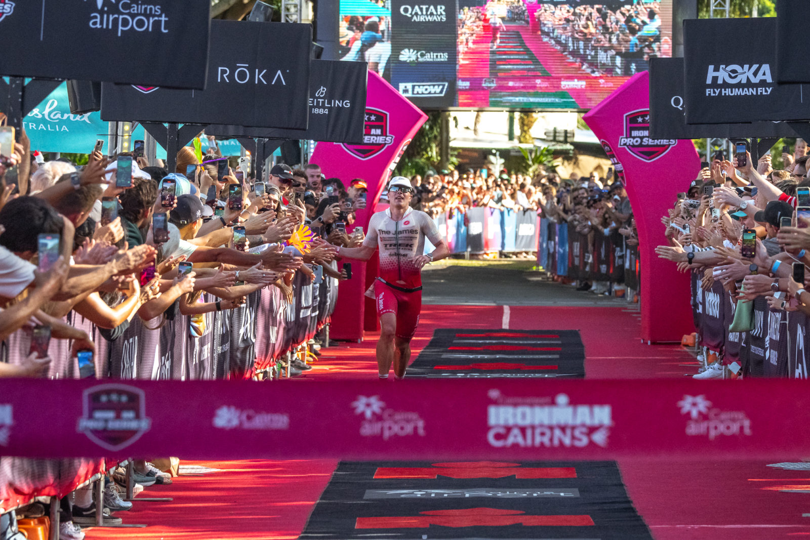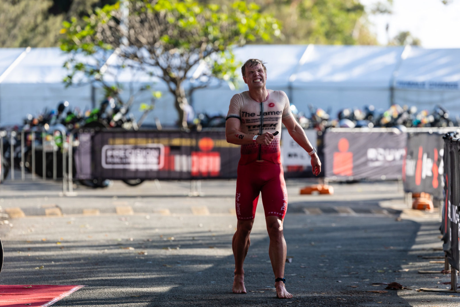 He was particularly proud of how much he had improved his run, but it’s not easy to show that off when you’re well out of podium contention. In his three years as a pro, he had taken six Ironman or Ironman 70.3 podiums prior to Cairns, and in four of them he finished within 2.5 minutes of the win, often after leading off the bike. He had a reputation for nailing the first two legs of his triathlon before fading late. But in Cairns, his run took center stage. On the four-loop run course he gradually ramped up his speed. Entering the third lap, he heard that leader Nick Thompson was suffering, and passed him before the start of the final loop.