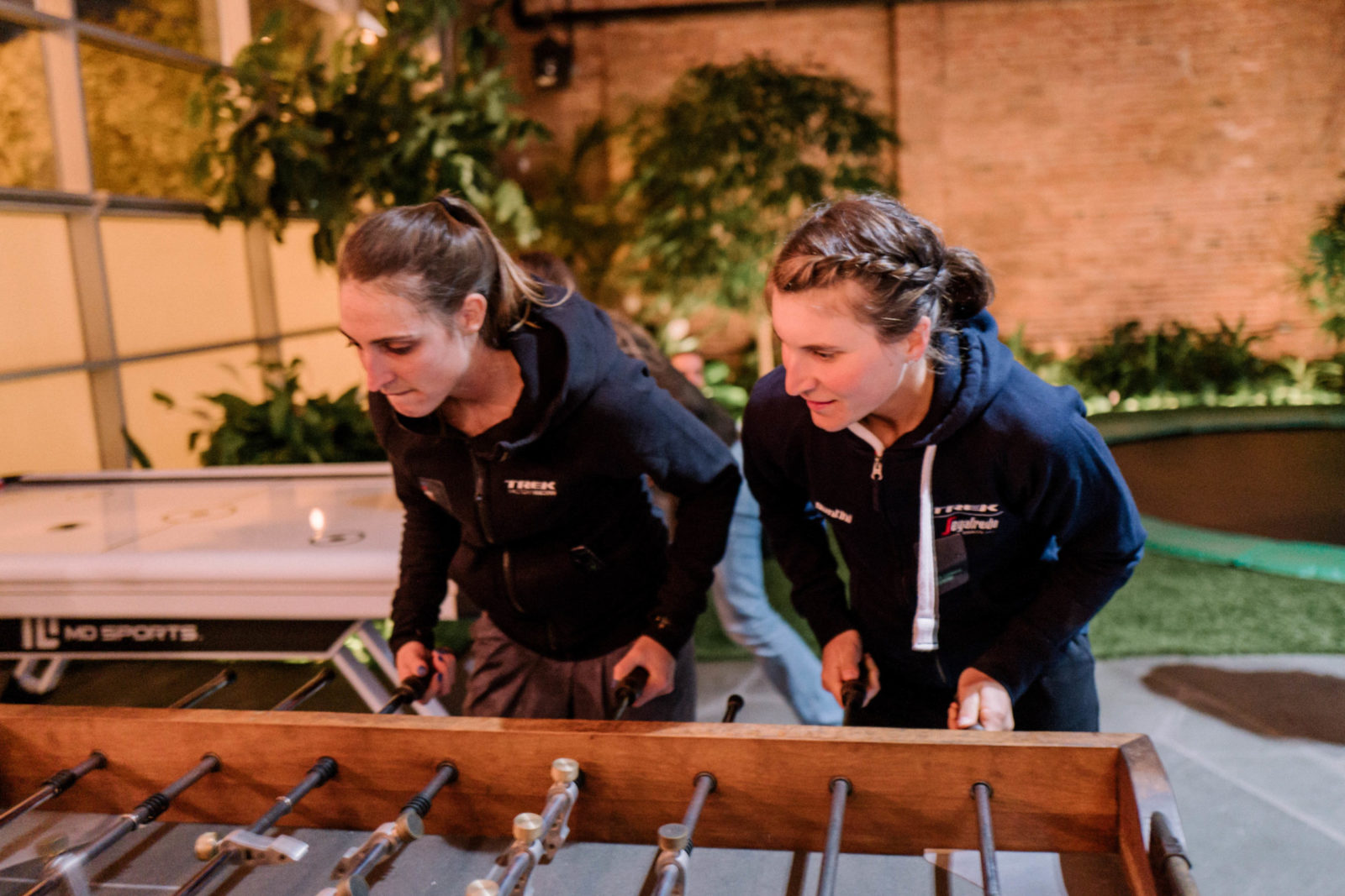 Lucinda Brand and Elisa Longo Borghini demonstrating a preferred form of exercise to riding a bike during Week 2 of the offseason.
