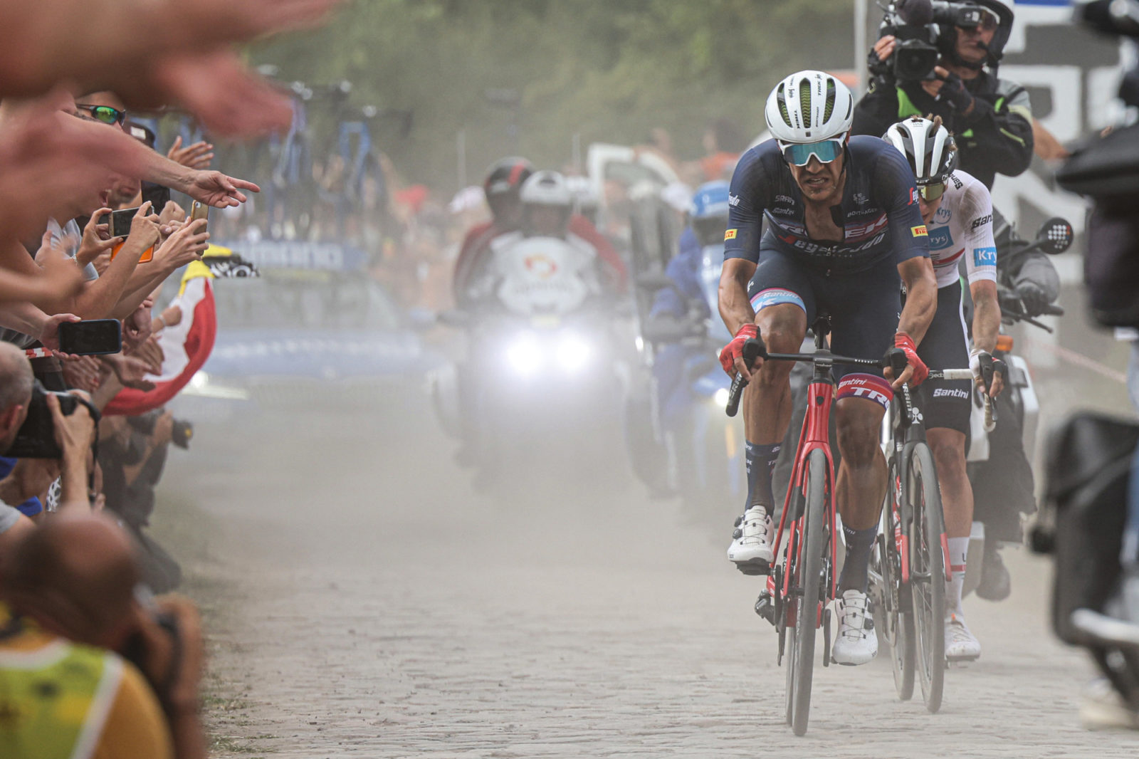 The Trek-Segafredo Belgian rose to the occasion, attacking in the third from last cobbled sector – with the incredible Tadej Pogacar along for company – and set off in search of the breakaway that had been out front all day.