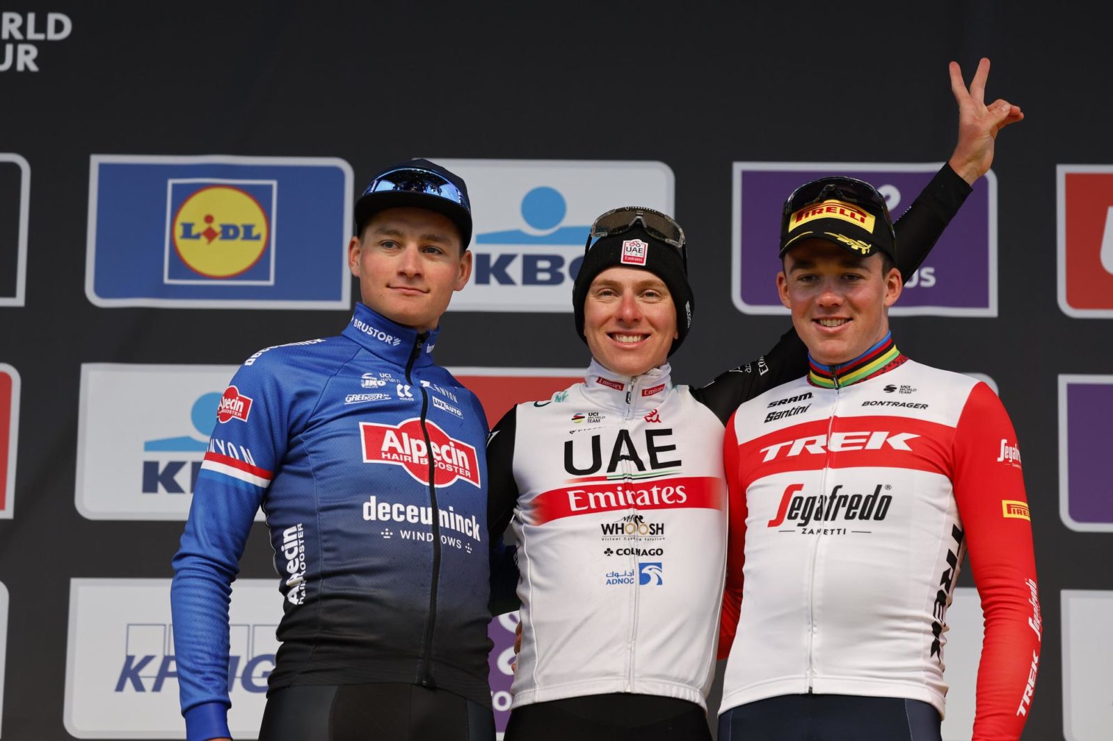 Behind him, the battle between ‘The Big Three’ had been brewing for some time and it was at this point of the race that Tadej Pogačar (UAE Team Emirates) made his ultimately winning move with Mathieu van der Poel (Alpecin – Deceuninck) the only other rider able to get in front of Pedersen.
