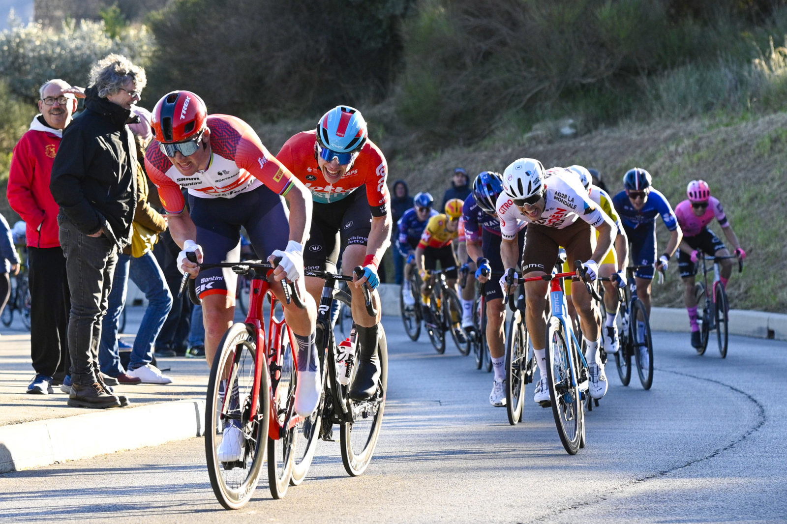 The race split earlier in the day, on two occasions, but came back together each time after a concerted chase. The second split, around 70km was the most significant, and saw five Trek-Segafredo riders on the safe side of the split. Unfortunately, Otto Vergaerde hit the deck int he crosswind chaos and broke his collarbone. The Belgian will be sidelined for the next few weeks as he recovers.
