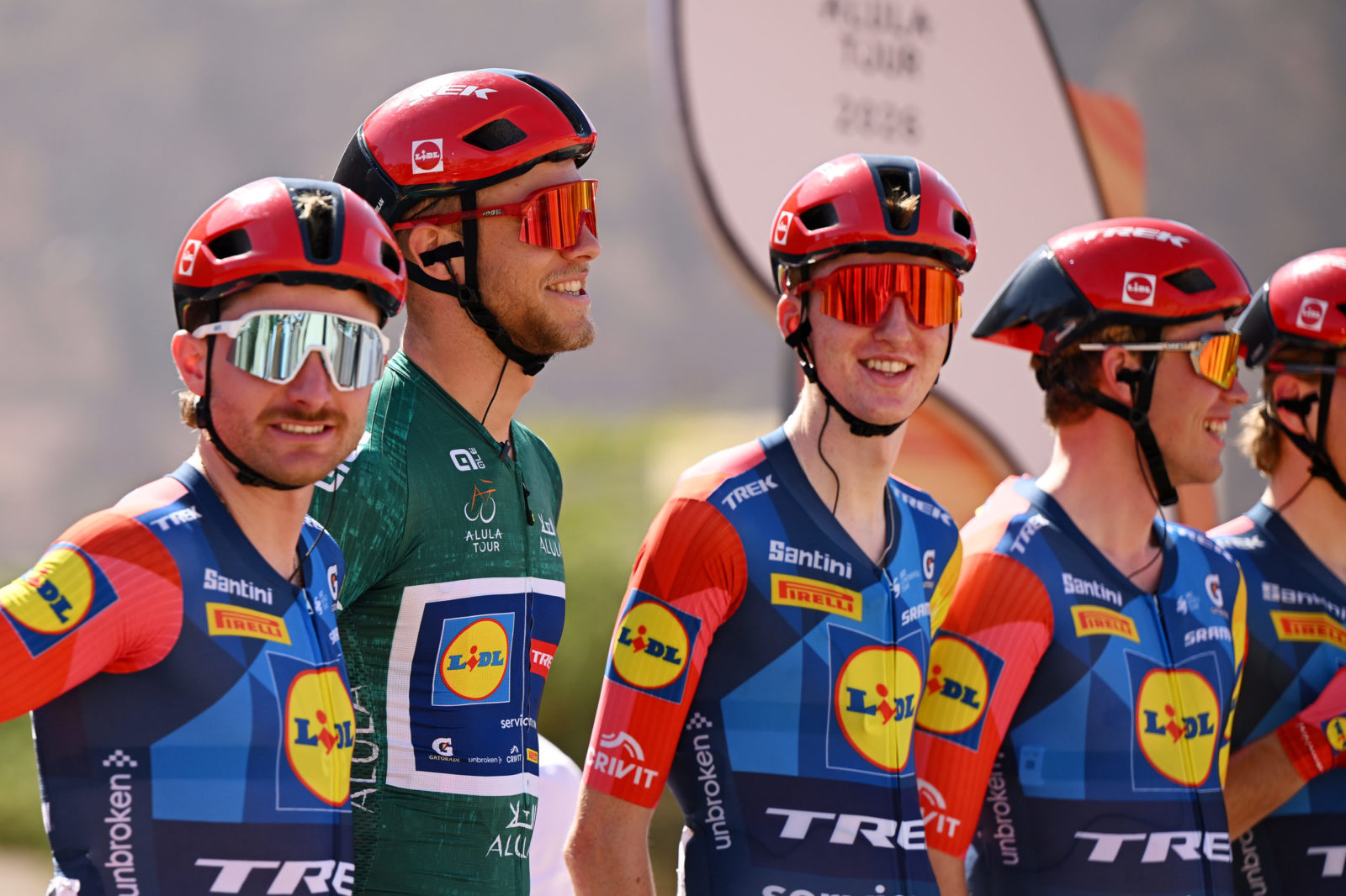 ALMANSHIYAH, SAUDI ARABIA - JANUARY 28: Jonathan Milan of Italy and Team Lidl - Trek - Green Leader Jersey prior to the 6th AlUla Tour 2026, Stage 2 a 158km stage from AlManshiyah Train Station to AlManshiyah Train Station on January 28, 2026 in AlManshiyah, Saudi Arabia. (Photo by Dario Belingheri/Getty Images)