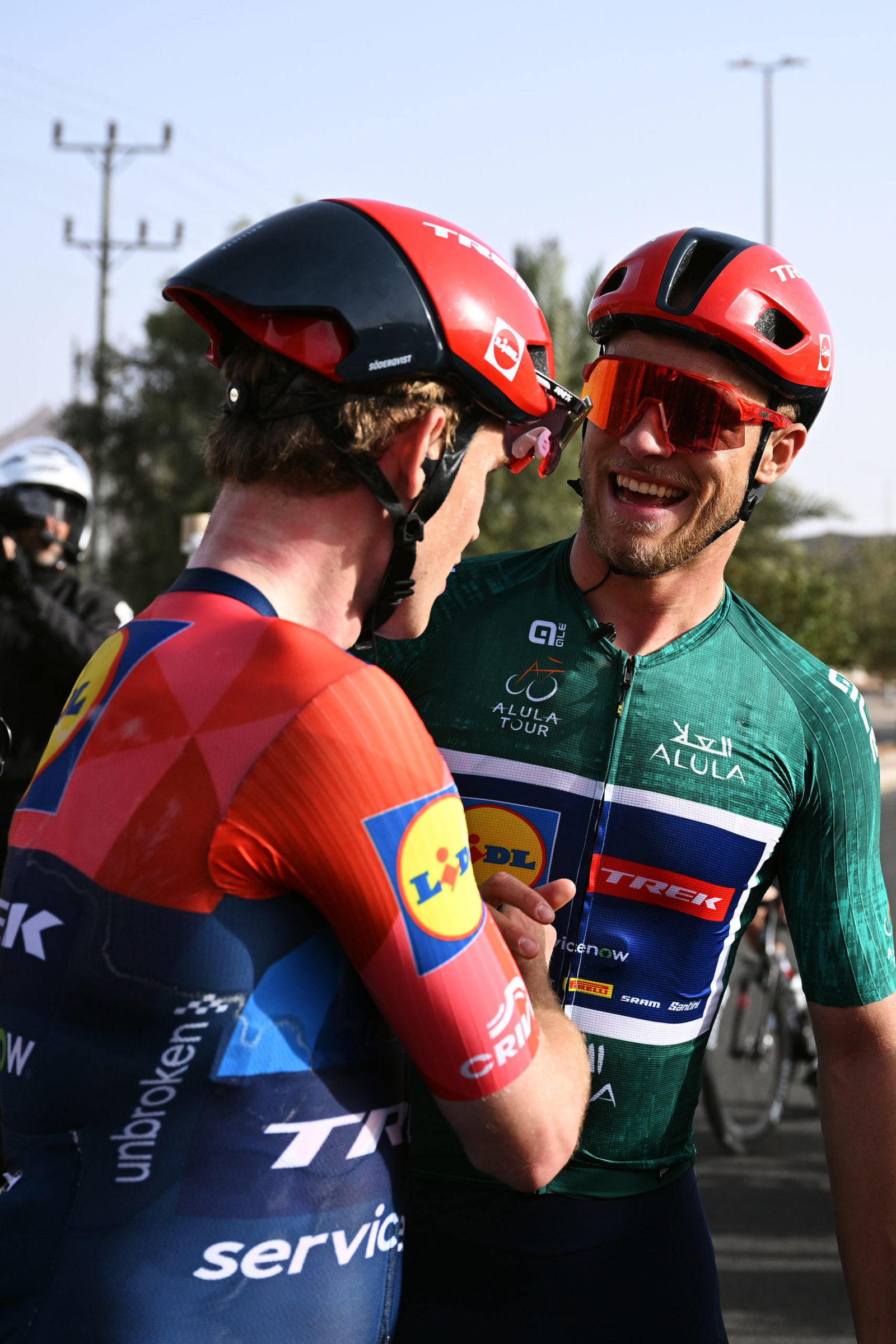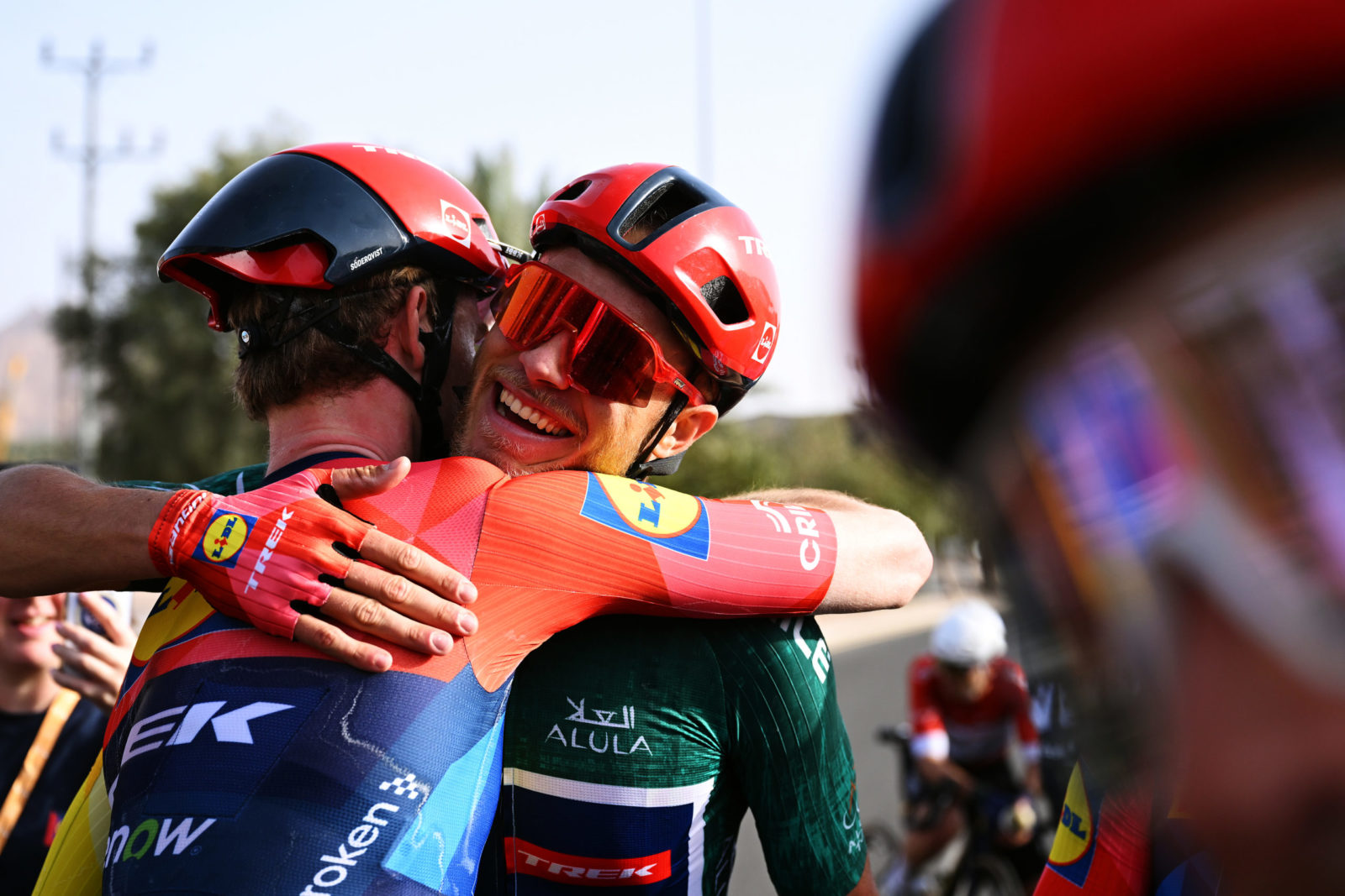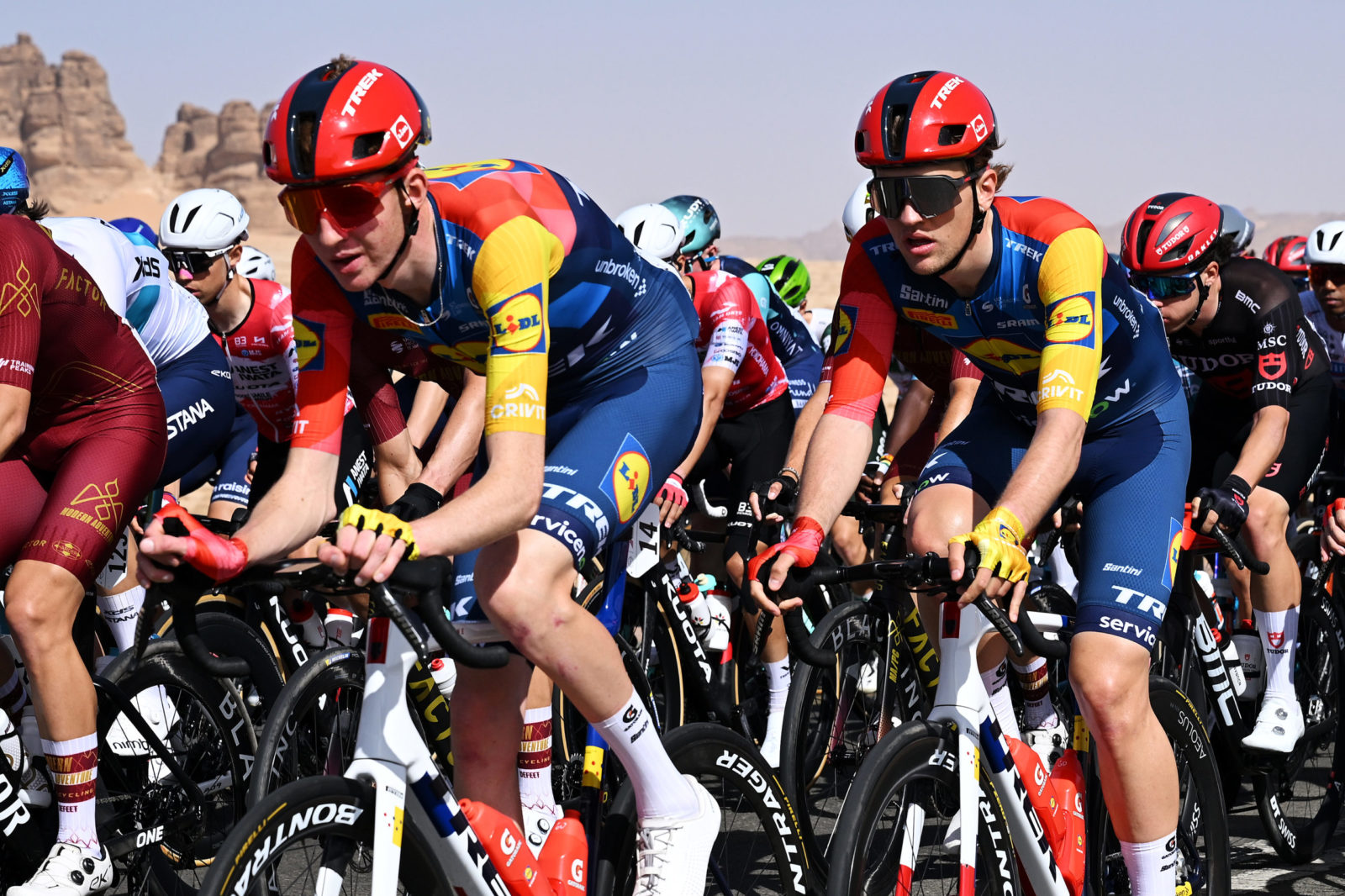 ALMANSHIYAH, SAUDI ARABIA - JANUARY 28: (L-R) Liam O'Brien of Ireland and Kristian Egholm of Denmark and Team Lidl - Trek compete during the 6th AlUla Tour 2026, Stage 2 a 152km stage from AlManshiyah Train Station to AlManshiyah Train Station on January 28, 2026 in AlManshiyah, Saudi Arabia. (Photo by Dario Belingheri/Getty Images)