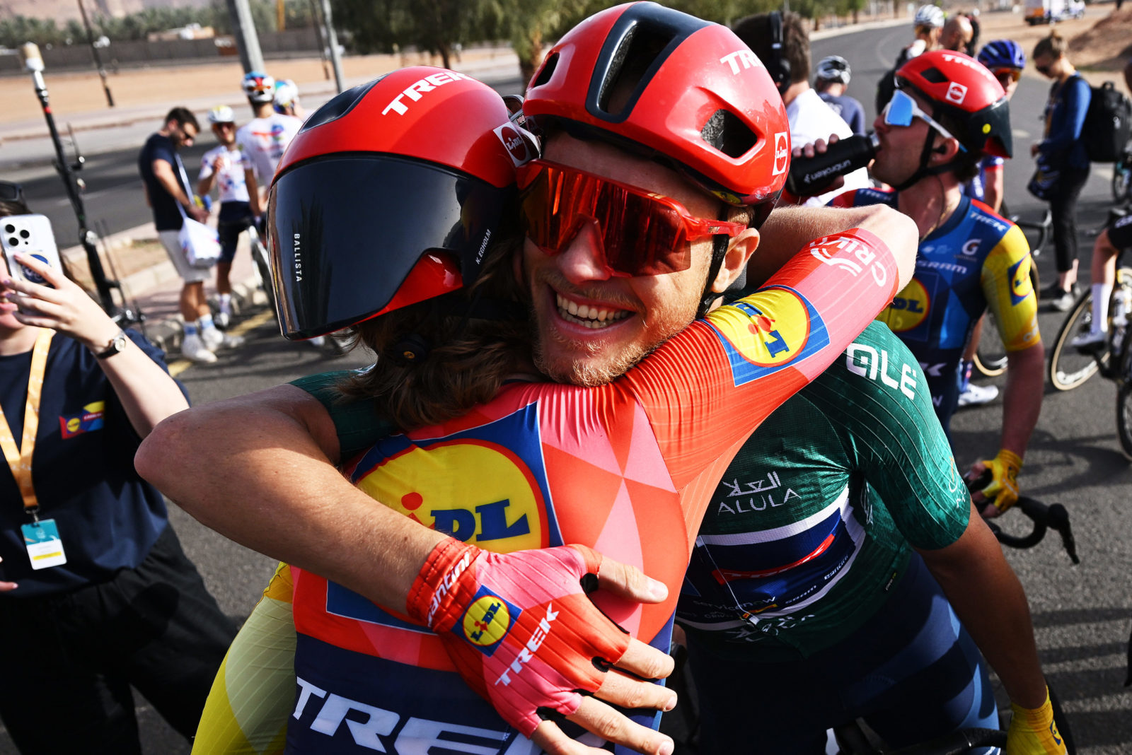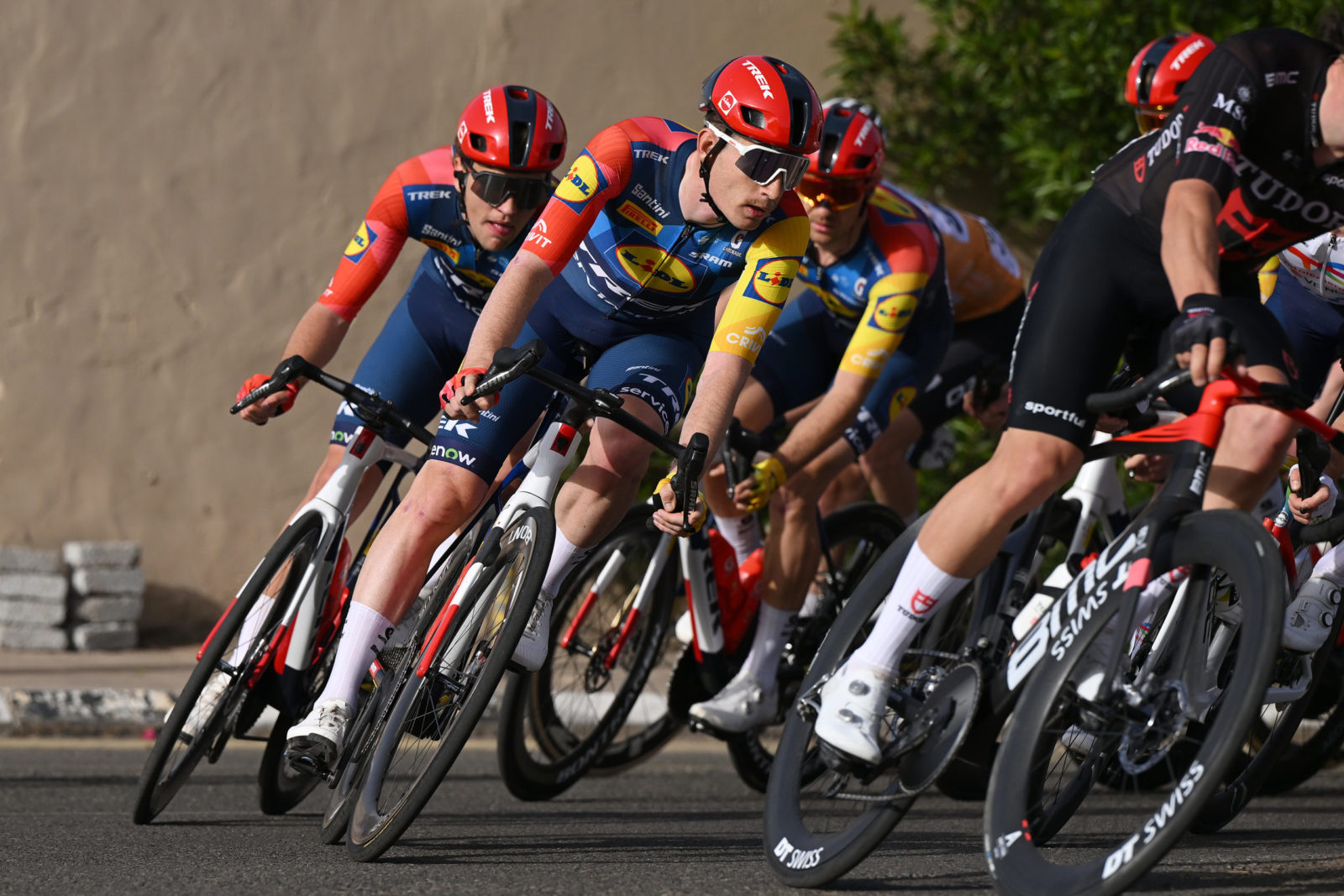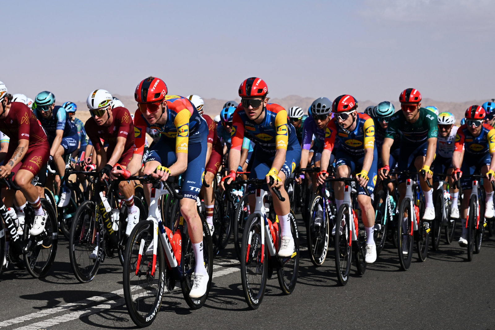 ALMANSHIYAH, SAUDI ARABIA - JANUARY 28: (L-R) Liam O'Brien of Ireland and Kristian Egholm of Denmark and Team Lidl - Trek compete during the 6th AlUla Tour 2026, Stage 2 a 152km stage from AlManshiyah Train Station to AlManshiyah Train Station on January 28, 2026 in AlManshiyah, Saudi Arabia. (Photo by Dario Belingheri/Getty Images)