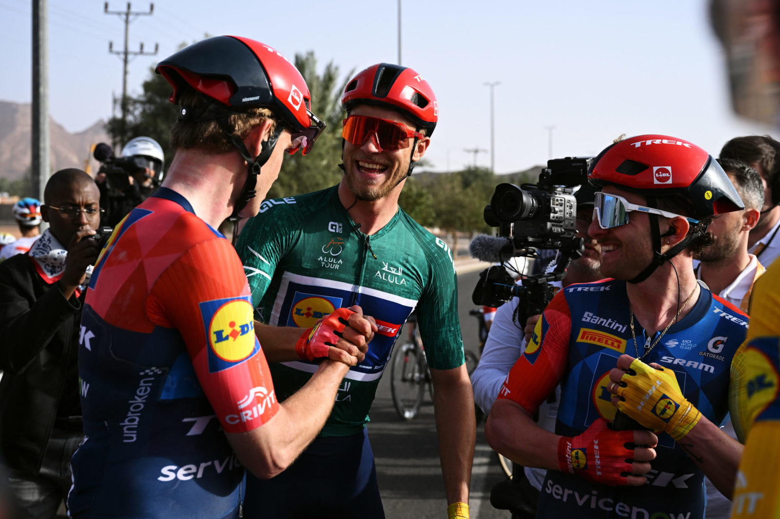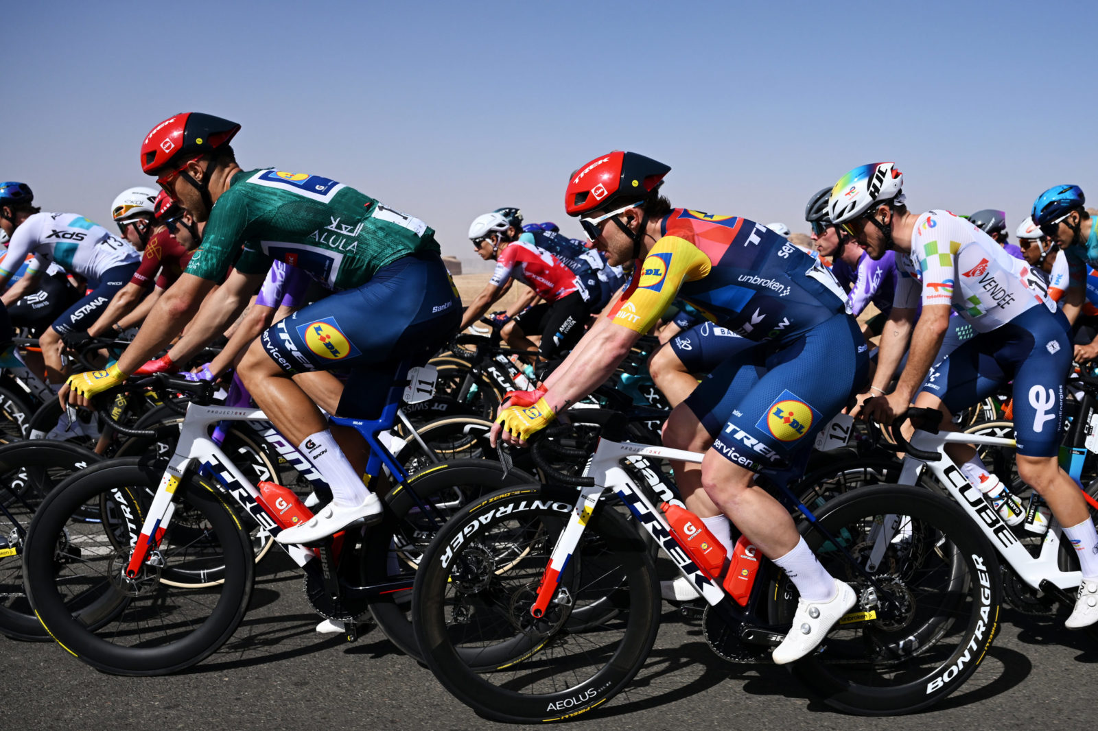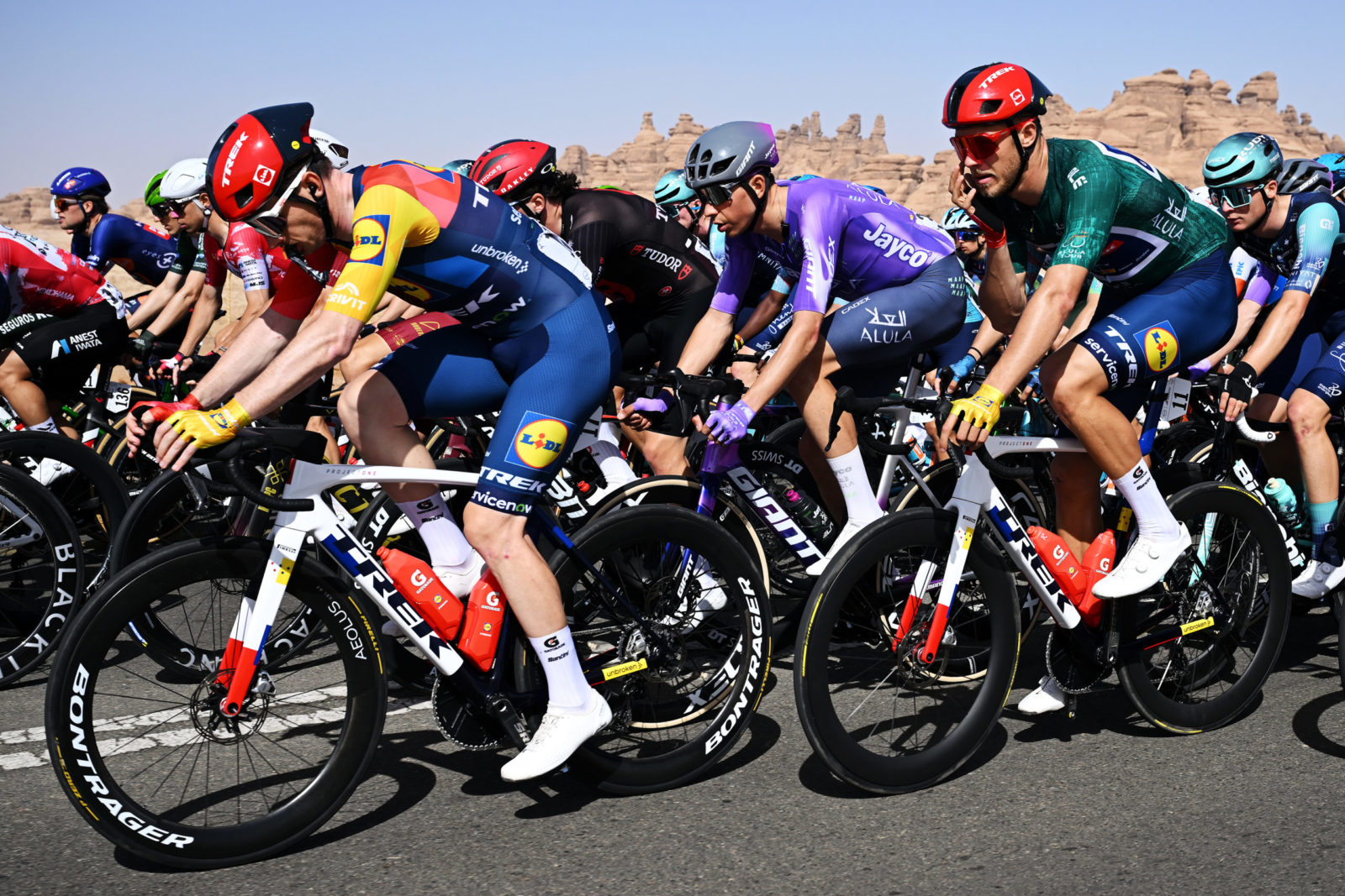 ALMANSHIYAH, SAUDI ARABIA - JANUARY 28: (L-R) Otto Vergaerde of Belgium and Team Lidl - Trek, Patrick Gamper of Austria and Jayco AlUla and Jonathan Milan of Italy and Team Lidl - Trek - Green Leader Jersey compete during the 6th AlUla Tour 2026, Stage 2 a 152km stage from AlManshiyah Train Station to AlManshiyah Train Station on January 28, 2026 in AlManshiyah, Saudi Arabia. (Photo by Dario Belingheri/Getty Images)