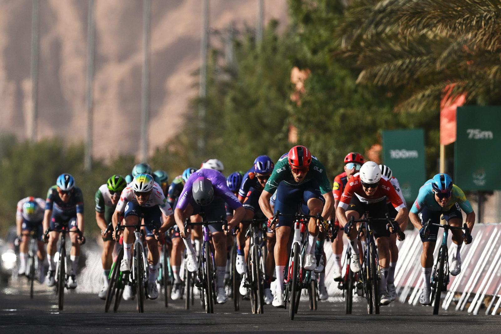 ALMANSHIYAH, SAUDI ARABIA - JANUARY 28: A general view of Jonathan Milan of Italy and Team Lidl - Trek - Green Leader Jersey, Daniel Skerl of Italy and Team Bahrain Victorious and Pascal Ackermann of Germany and Team Jayco AlUla sprint at finish line during the 6th AlUla Tour 2026, Stage 2 a 152km stage from AlManshiyah Train Station to AlManshiyah Train Station on January 28, 2026 in AlManshiyah, Saudi Arabia. (Photo by Dario Belingheri/Getty Images)