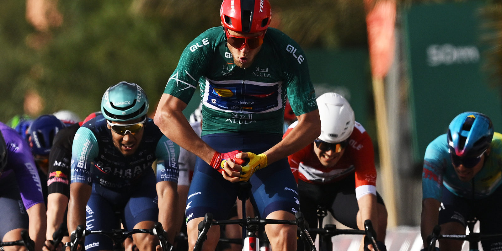 ALMANSHIYAH, SAUDI ARABIA - JANUARY 28: Jonathan Milan of Italy and Team Lidl - Trek - Green Leader Jersey, Daniel Skerl of Italy and Team Bahrain Victorious and Pascal Ackermann of Germany and Team Jayco AlUla sprint at finish line during the 6th AlUla Tour 2026, Stage 2 a 152km stage from AlManshiyah Train Station to AlManshiyah Train Station on January 28, 2026 in AlManshiyah, Saudi Arabia. (Photo by Dario Belingheri/Getty Images)